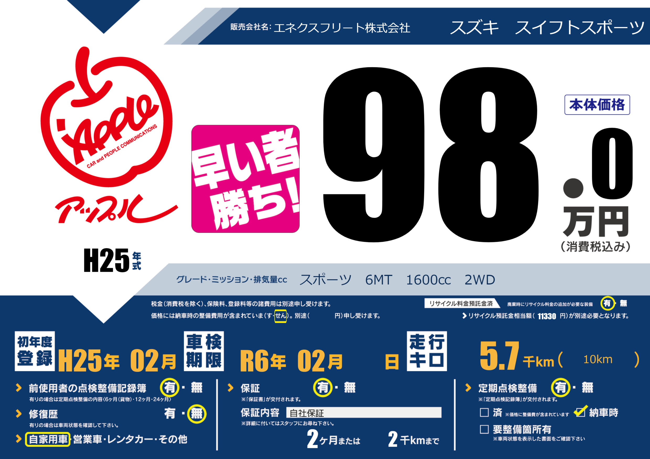 | 車名 | スズキ スイフトスポーツ | グレード ミッション 排気量 |