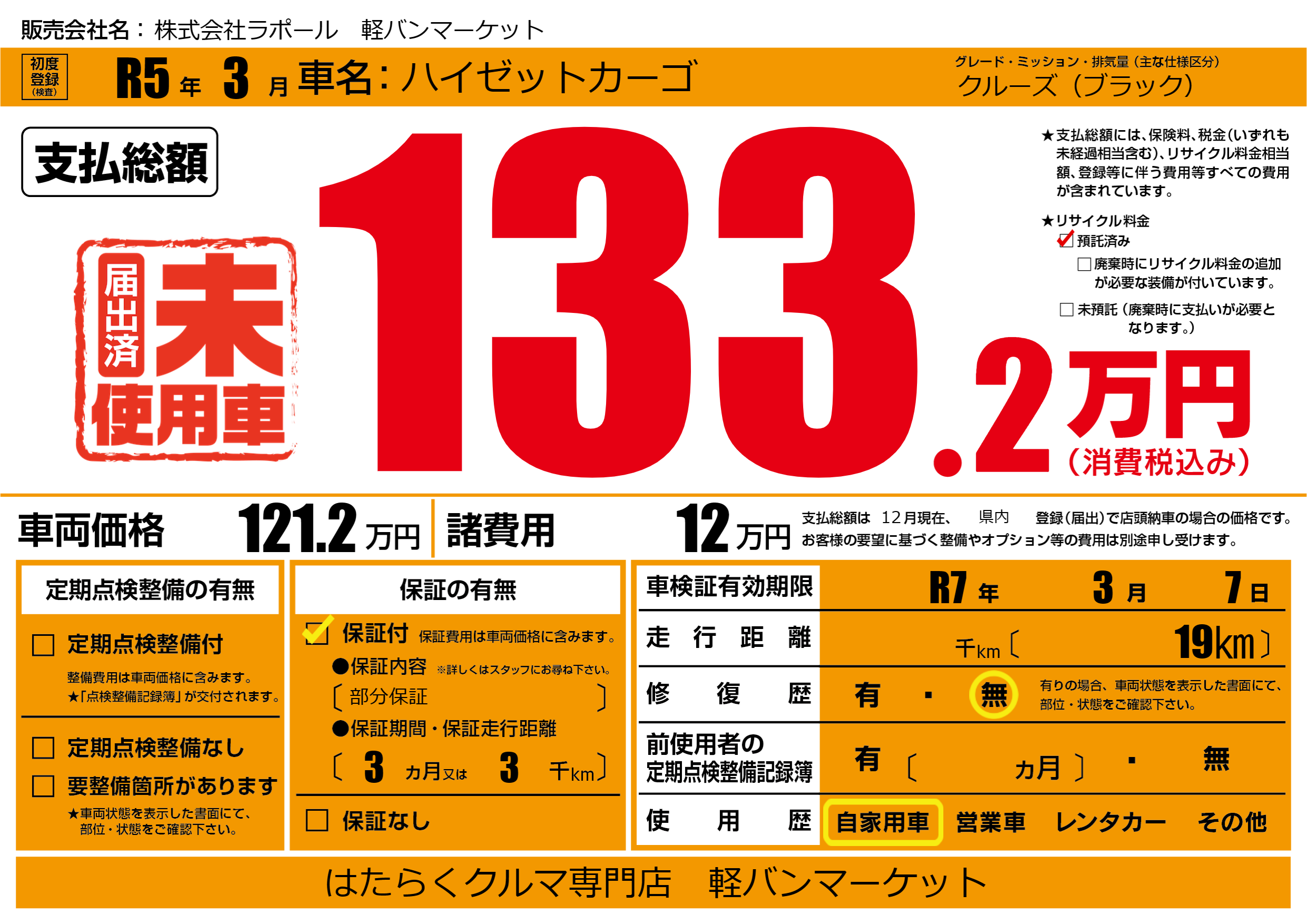 | 車名 | ハイゼットカーゴ | グレード ミッション 排気量 |