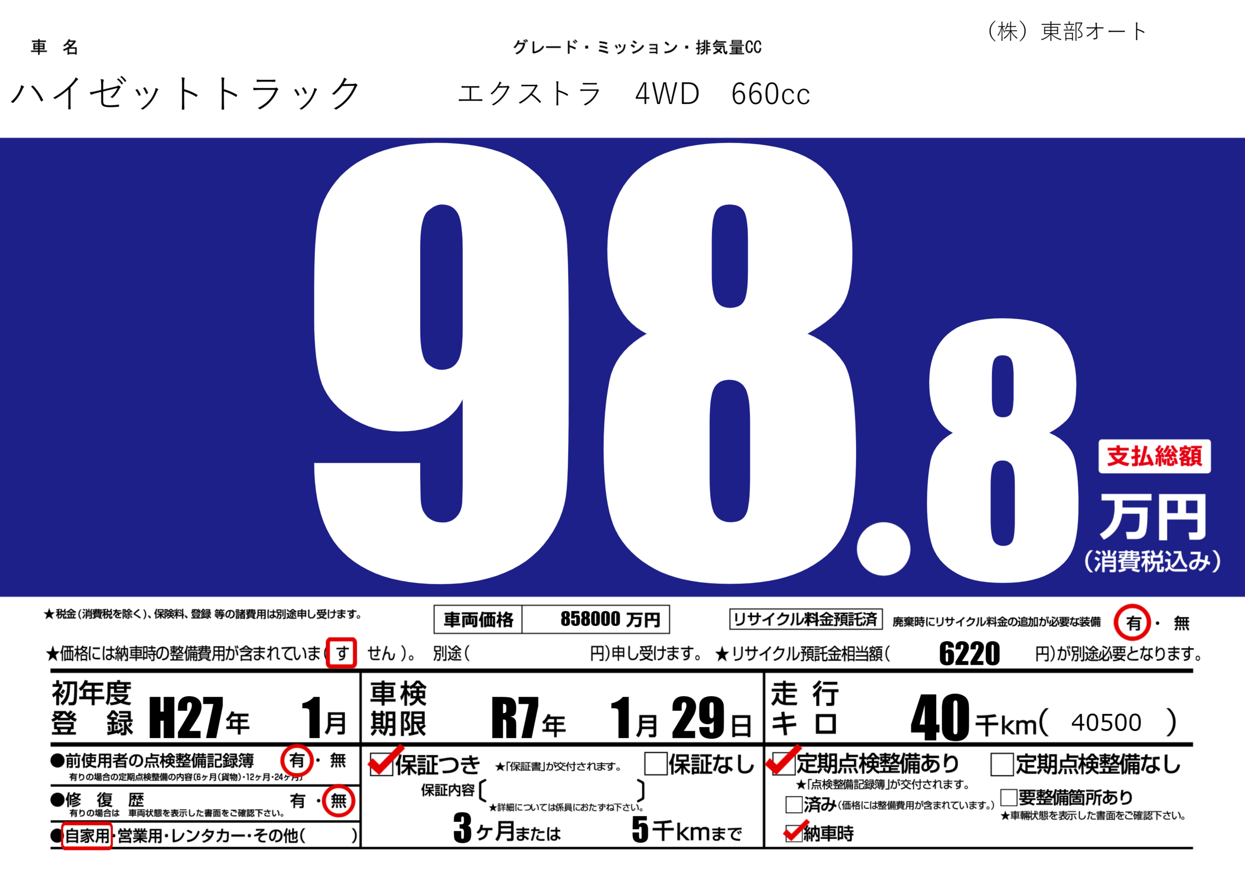 | 車名 | ハイゼットトラック | グレード ミッション 排気量 |