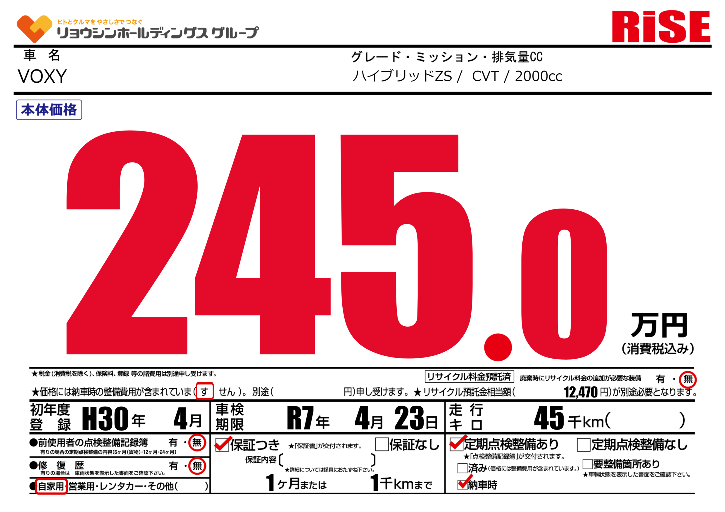 | 車名 | VOXY | グレード ミッション 排気量 |