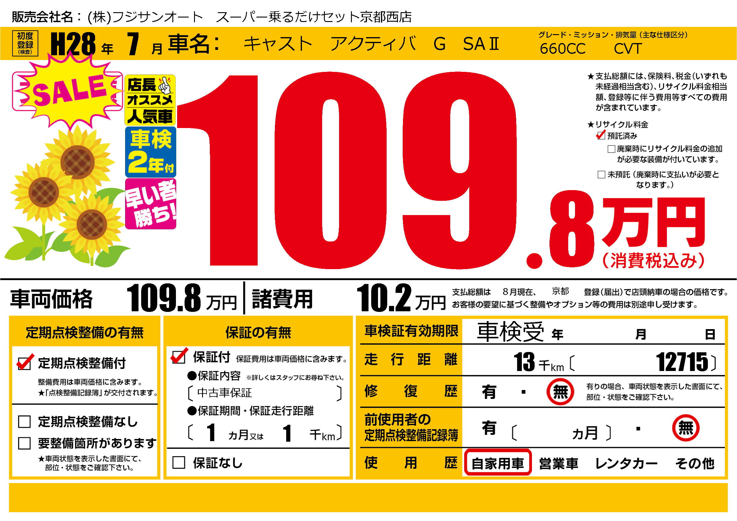| 走行キロ | 1.3万km | 初年度登録 | H28年7月 |