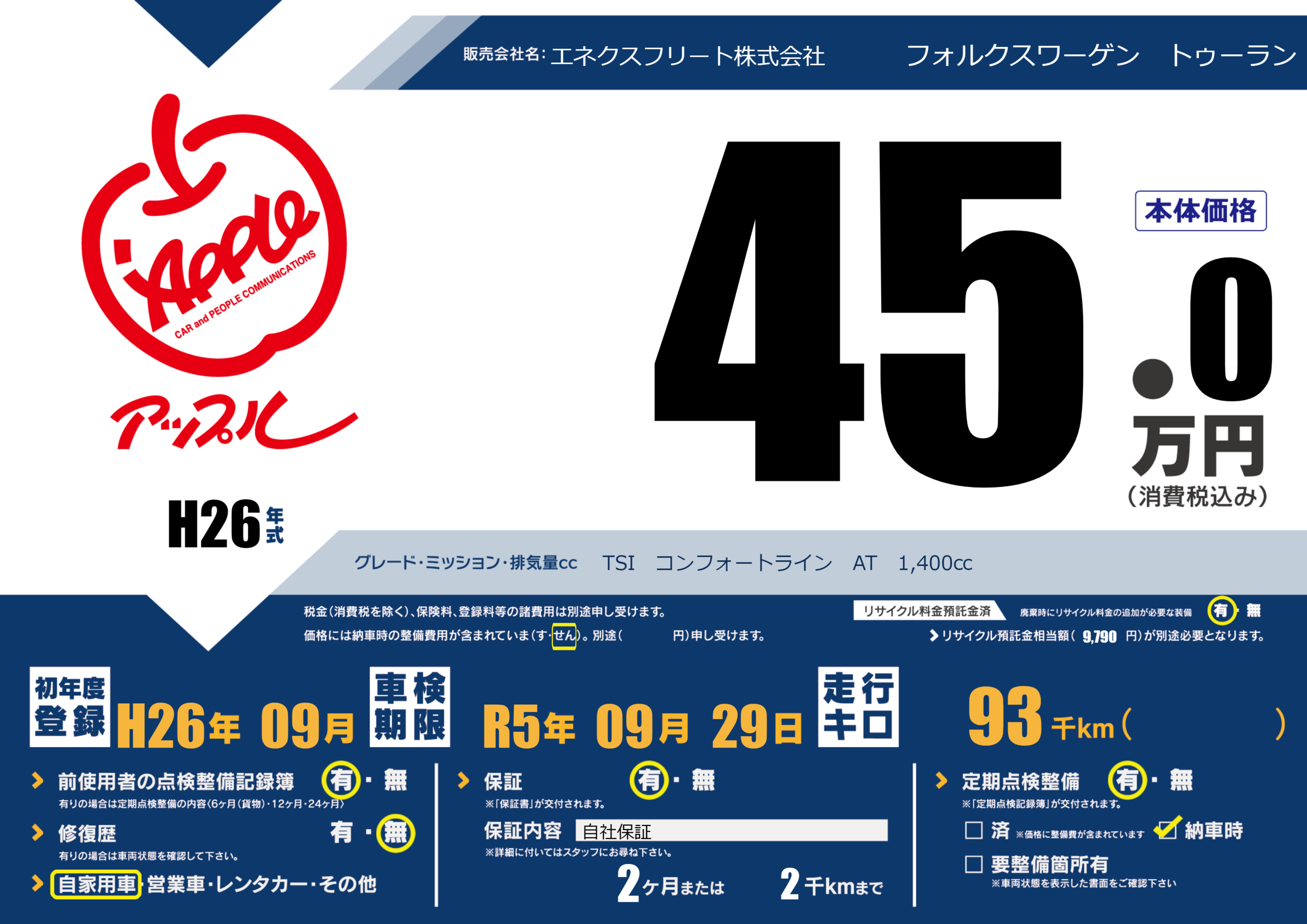 | 走行キロ | 9.3万km | 初年度登録 | H26年09月 |