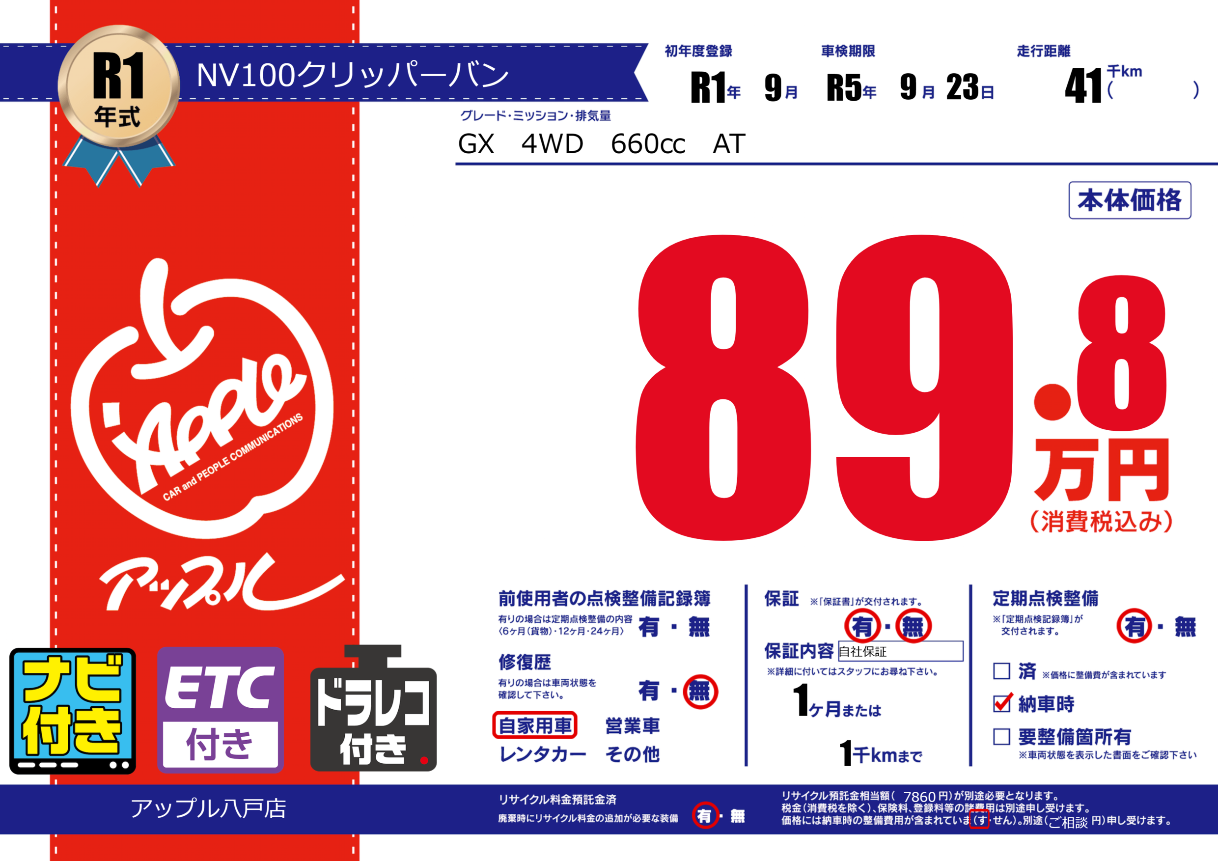 | 定期点検整備 | 定期点検整備あり 納車時あり | ||
