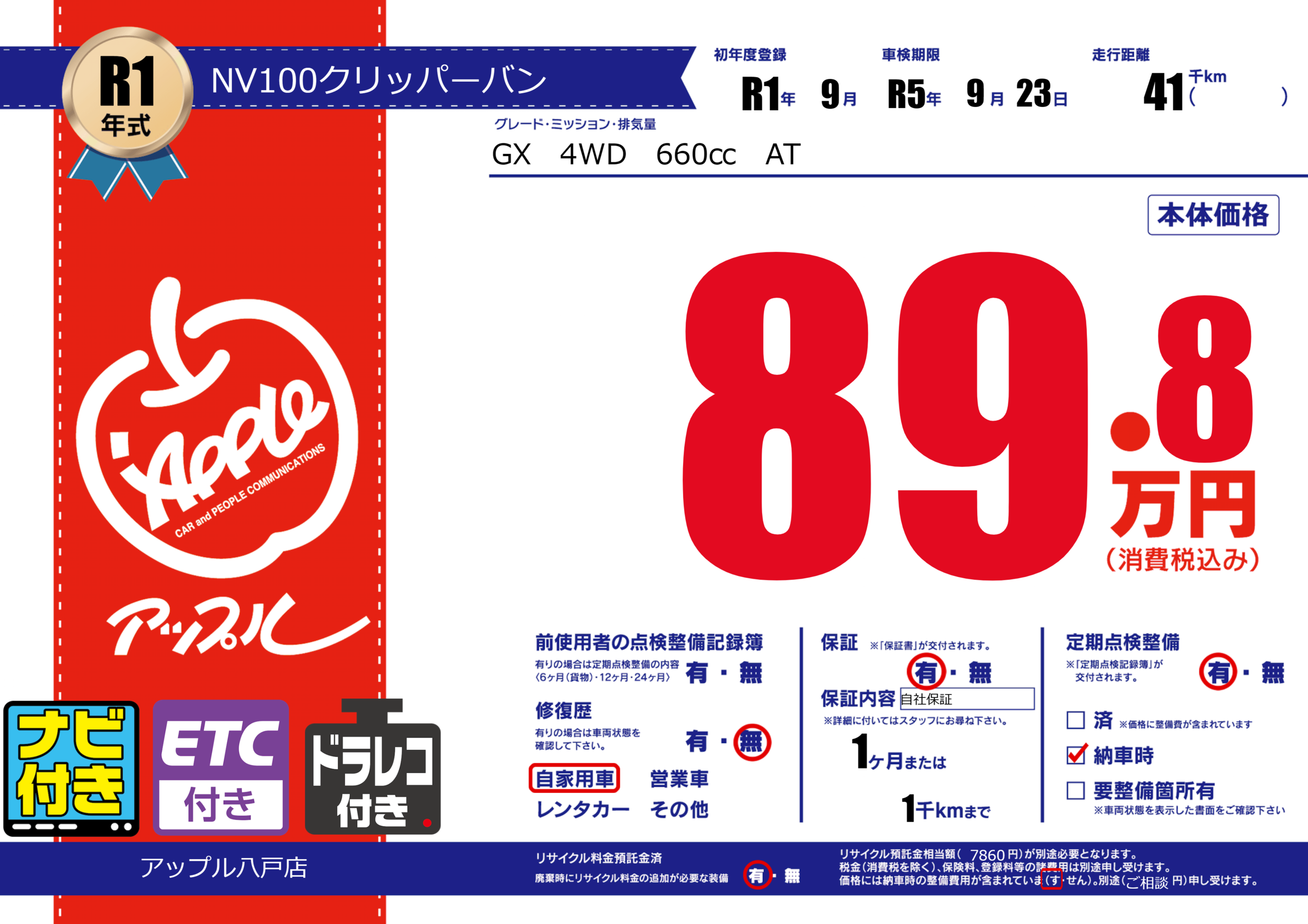 保証付き 保証内容(自社保証) 1ヶ月または(1)千kmまで |