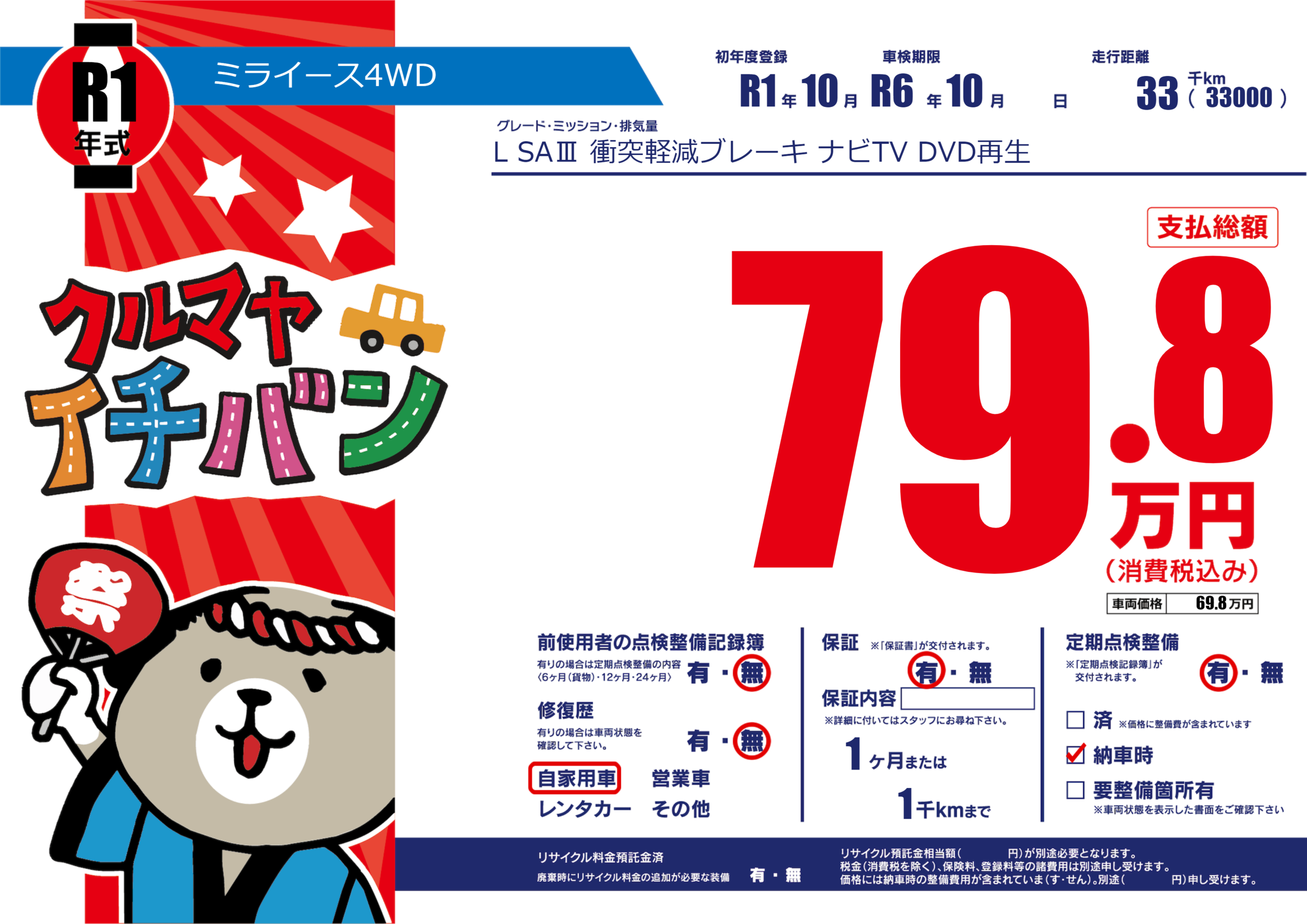 | 定期点検整備 | 定期点検整備あり 納車時あり | ||