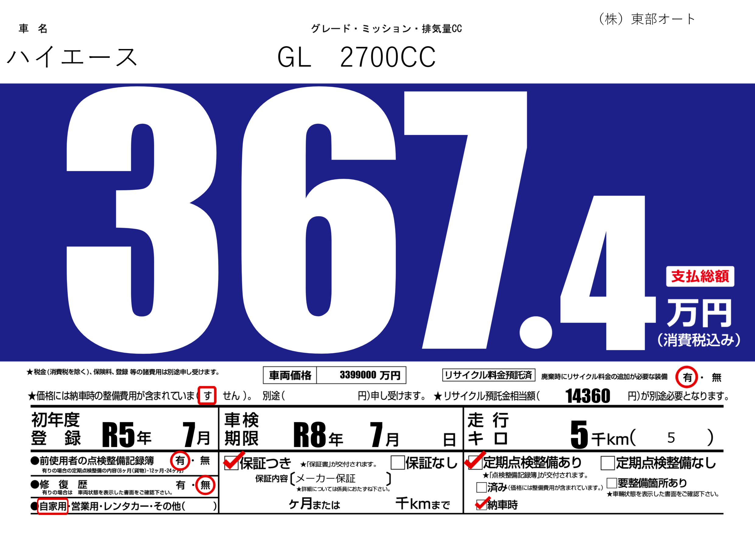 | 車名 | ハイエース | グレード ミッション 排気量 |