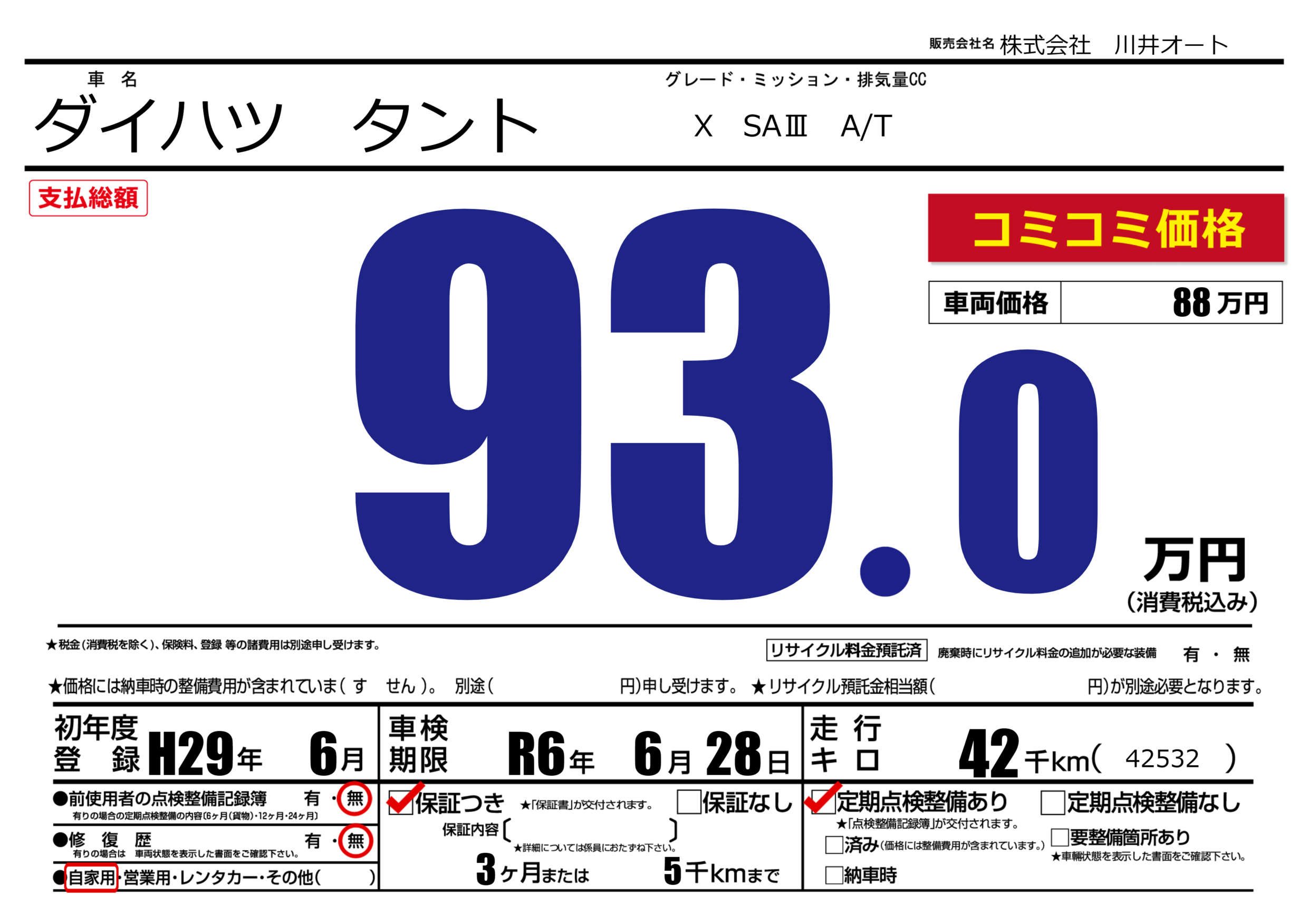 | 車名 | ダイハツ タント | グレード ミッション 排気量 |