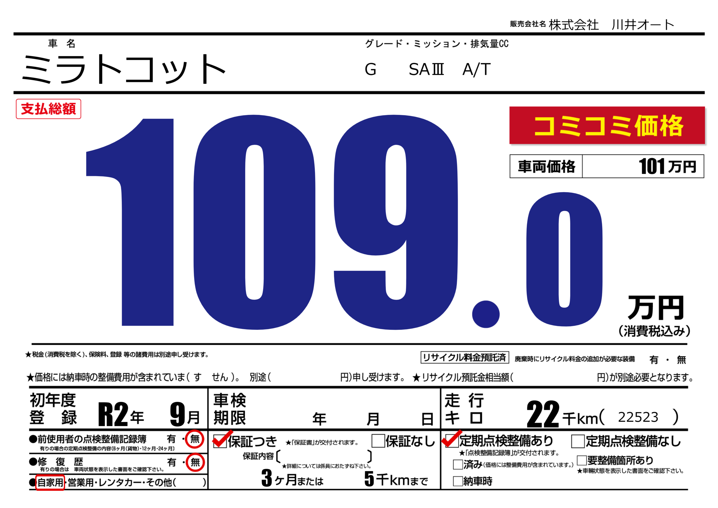 | 車名 | ミラトコット | グレード ミッション 排気量 |