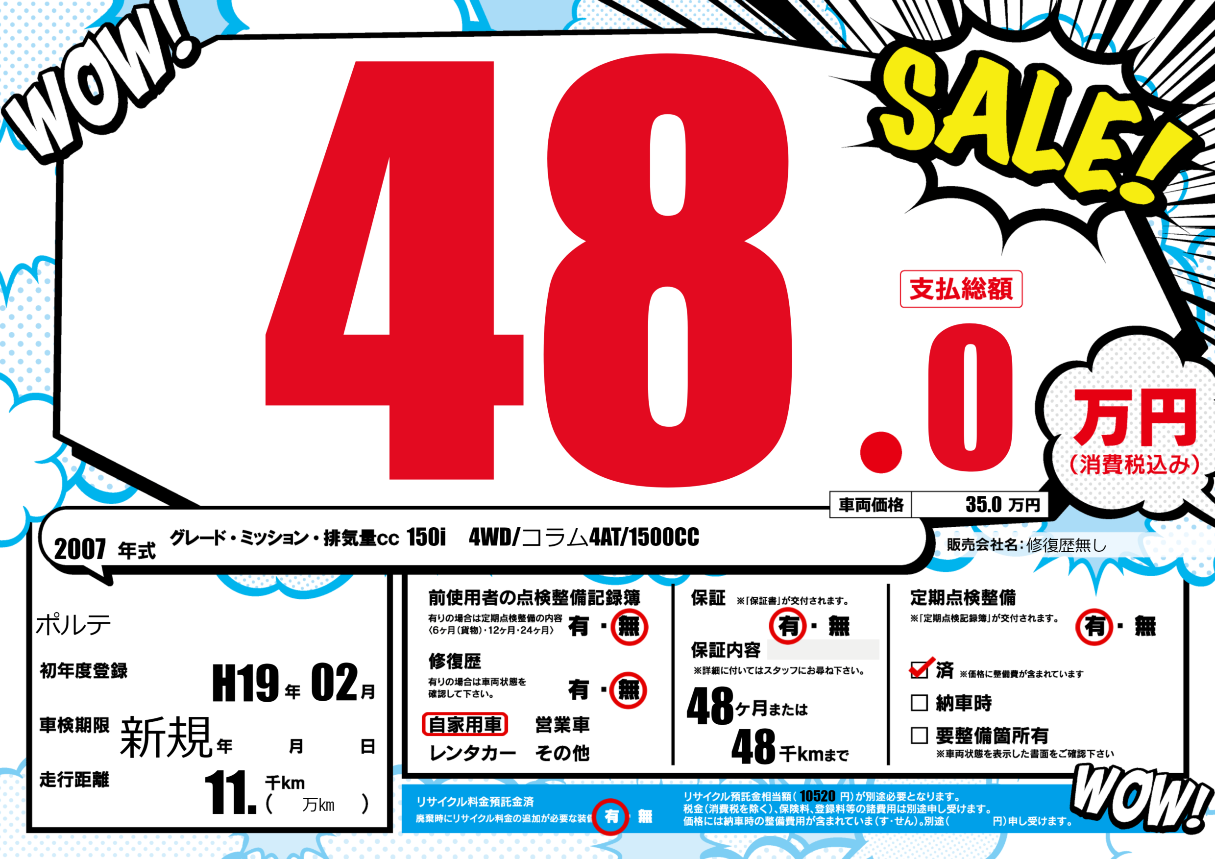 | 定期点検整備 | 定期点検整備あり 定期点検整備済み | ||