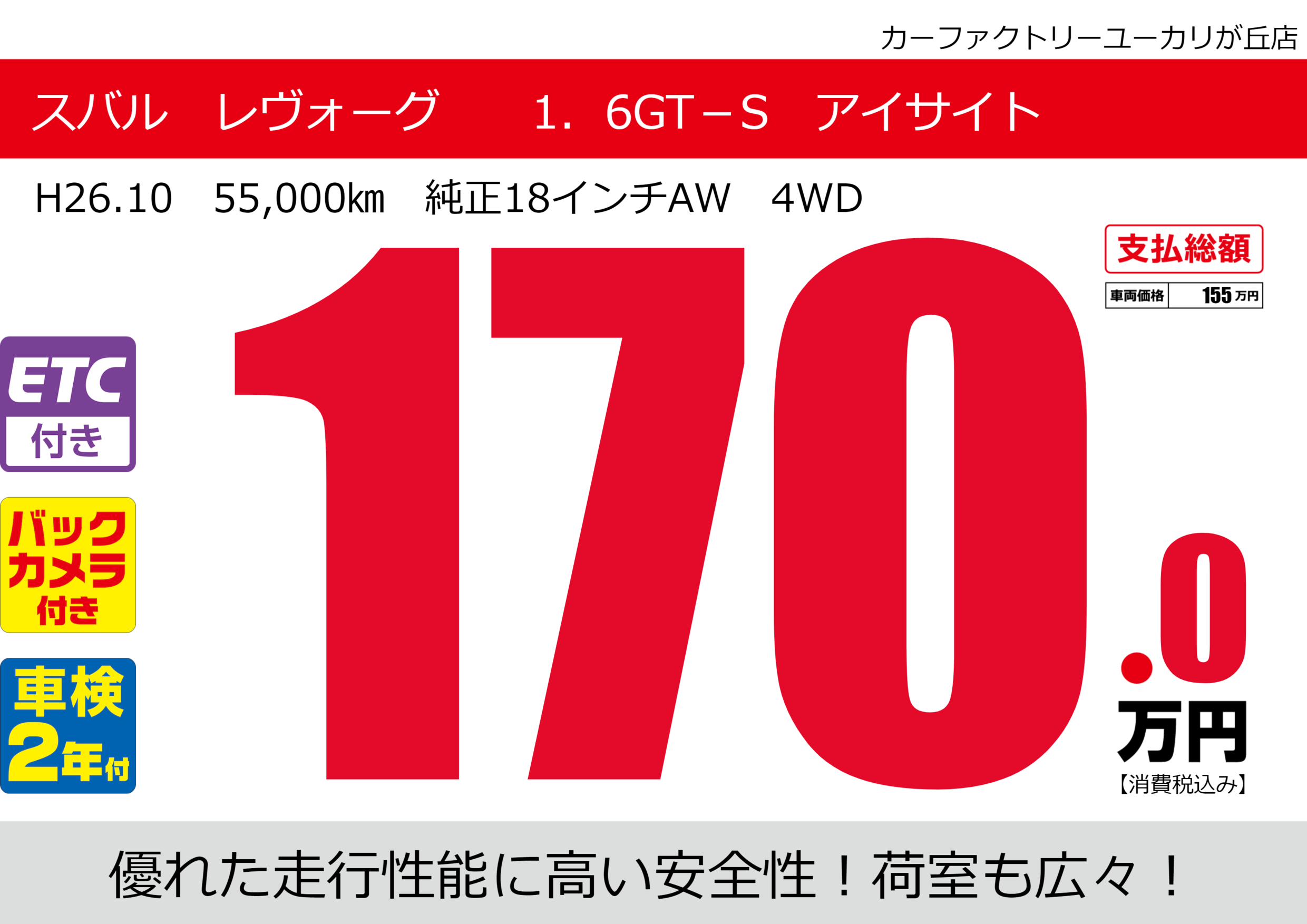 | 車名 | スバル レヴォーグ 1.6GT-S アイサイト | グレード ミッション 排気量 |