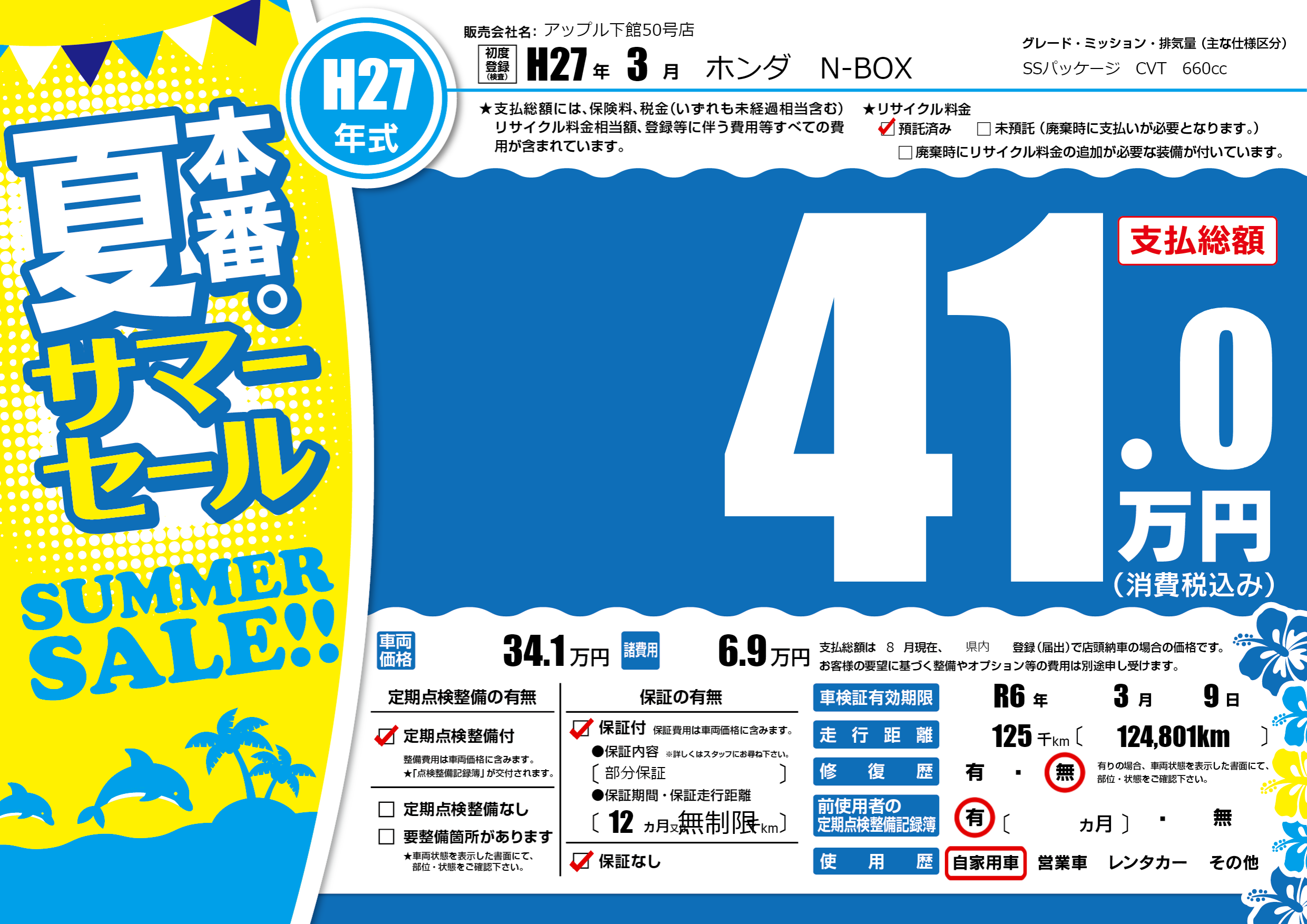 | 走行キロ | 12.5万km | 初年度登録 | H27年3月 |