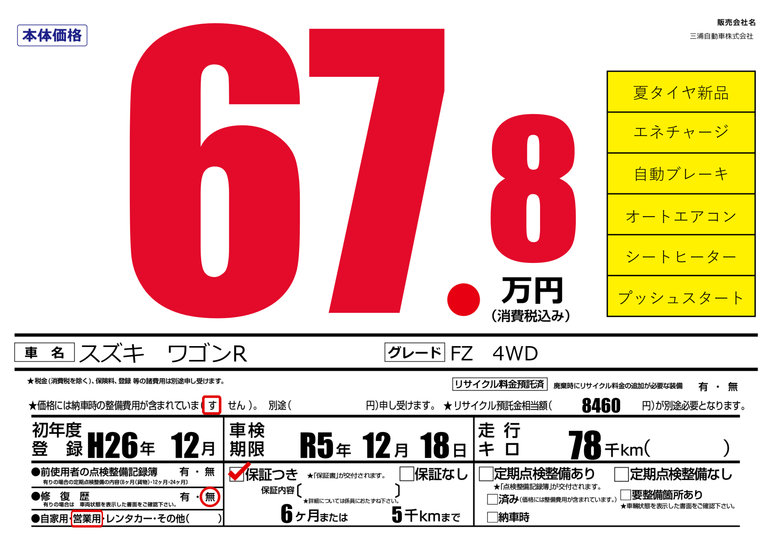 | 車名 | スズキ ワゴンR | グレード ミッション 排気量 |