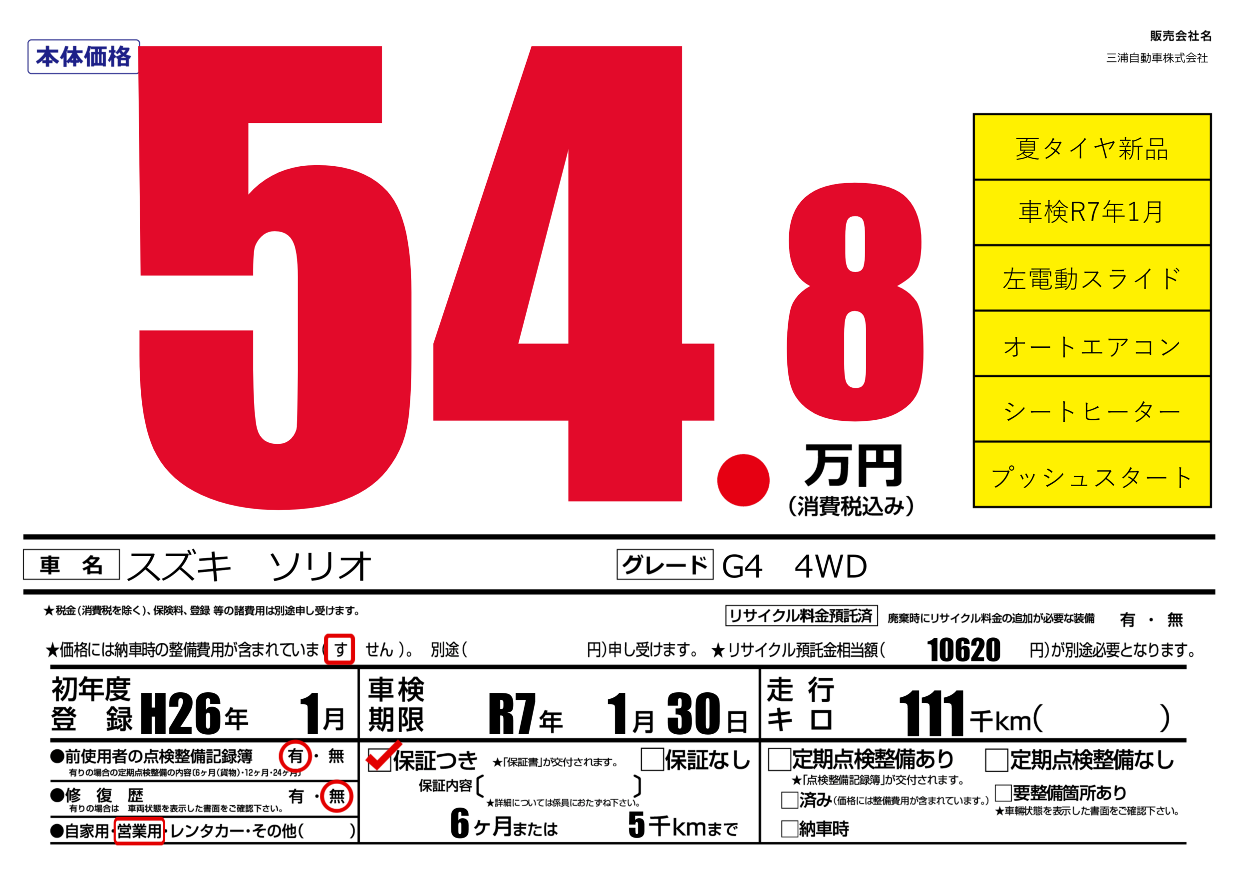 保証付き 保証内容(---) 6ヶ月または(5)千kmまで |
