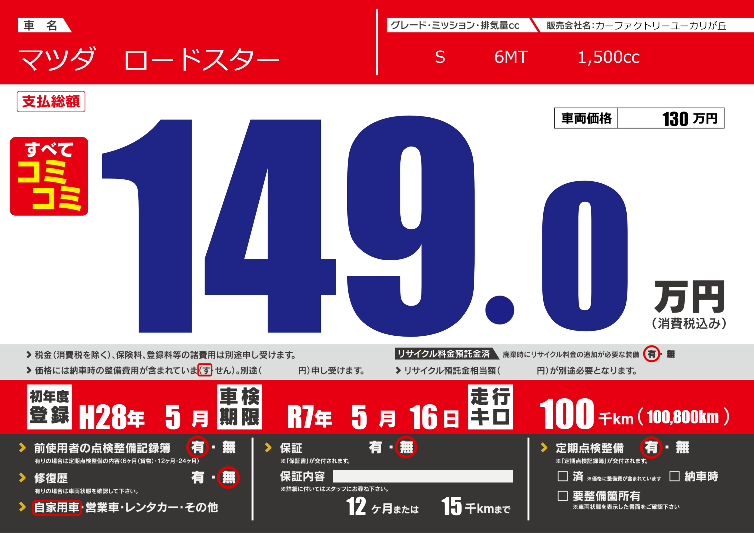 | 車名 | マツダ ロードスター | グレード ミッション 排気量 |