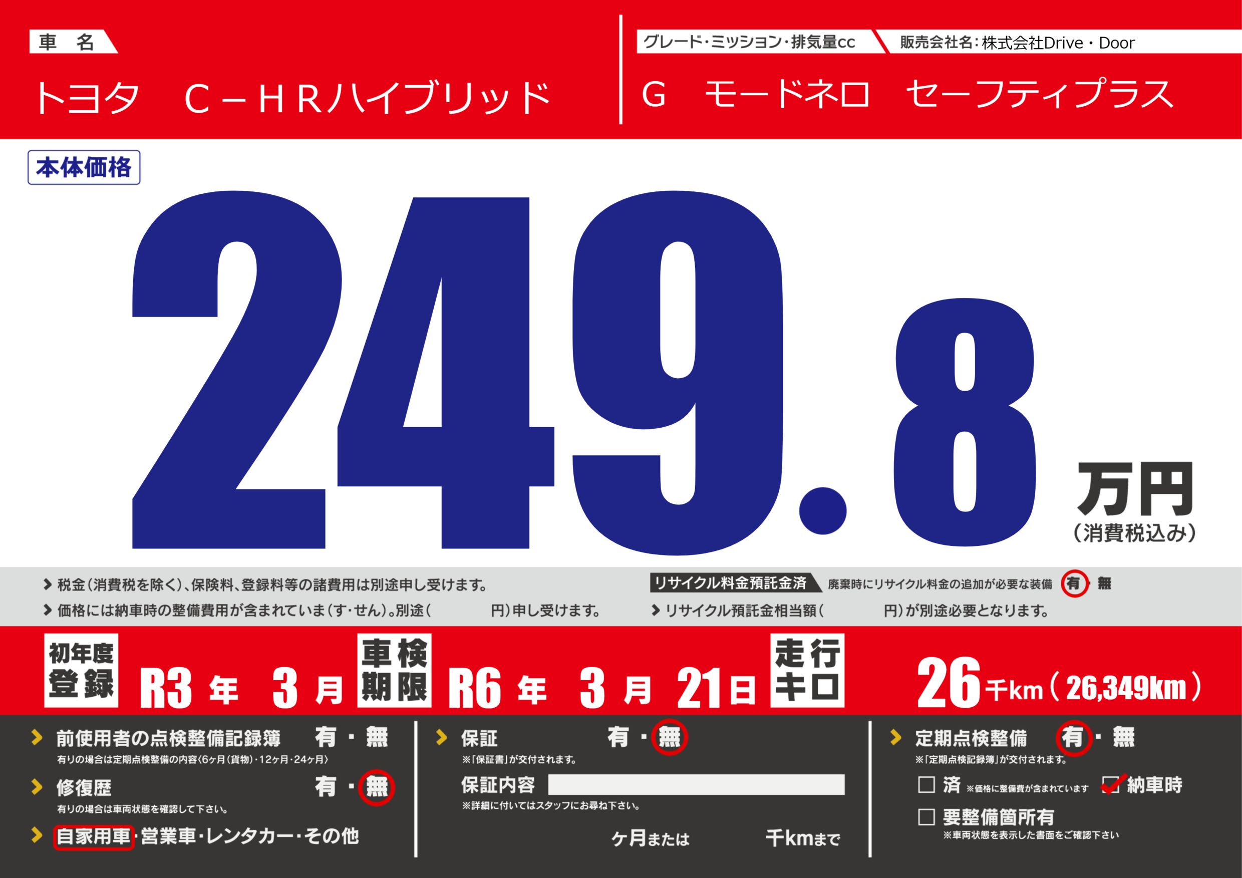 | 車名 | トヨタ C-HRハイブリッド | グレード ミッション 排気量 |
