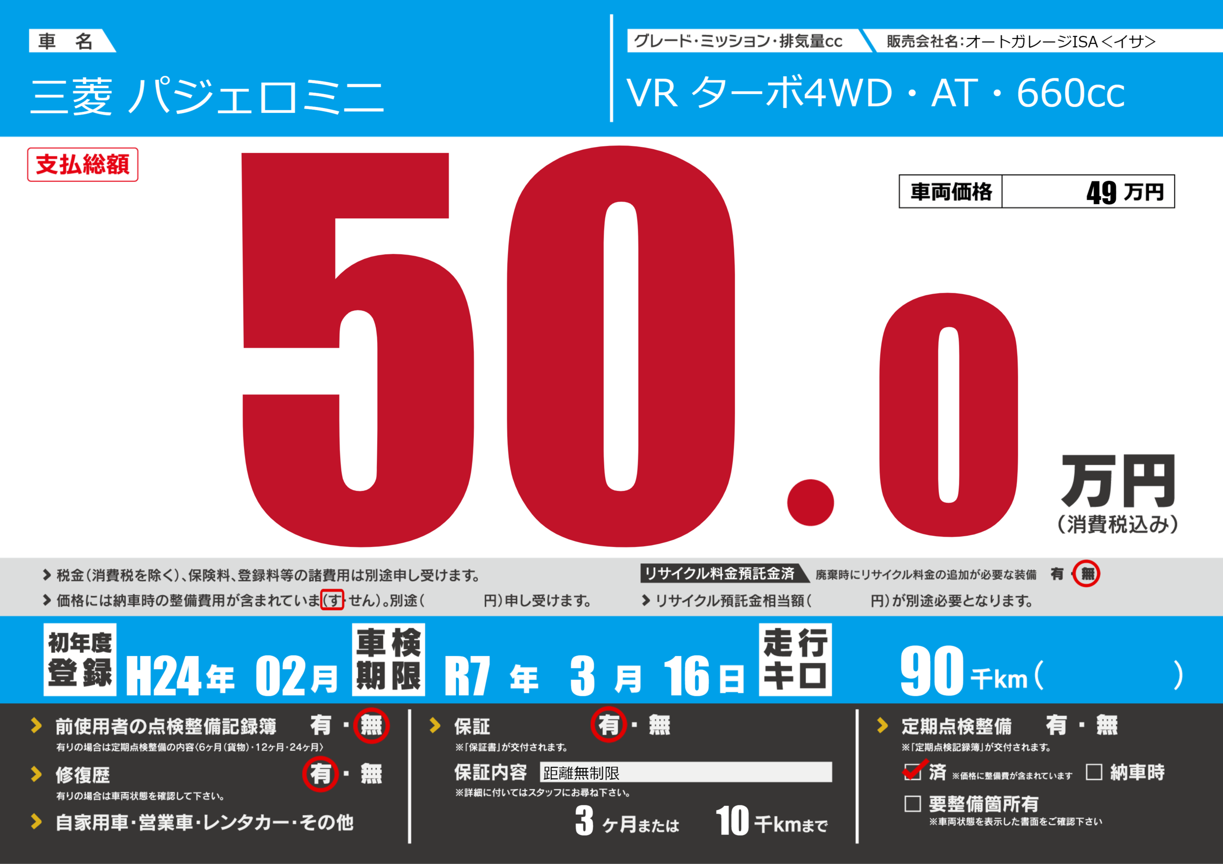 | 車名 | 三菱 パジェロミニ | グレード ミッション 排気量 |