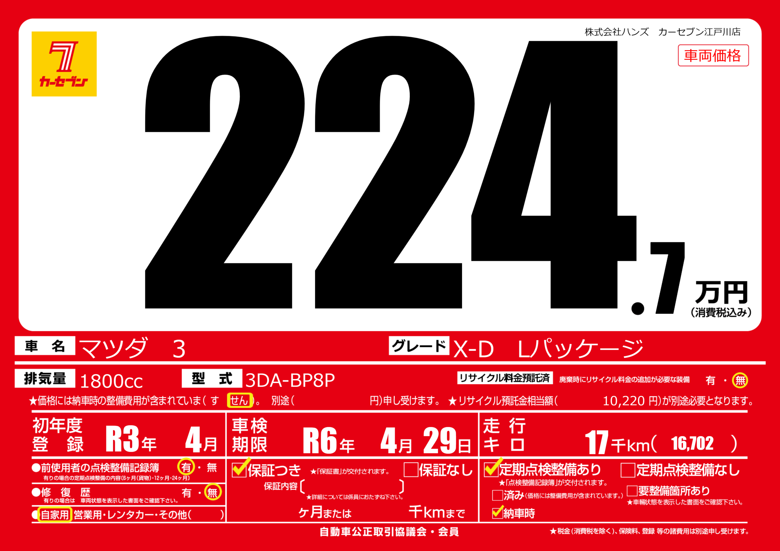 | 車名 | マツダ 3 | グレード ミッション 排気量 |