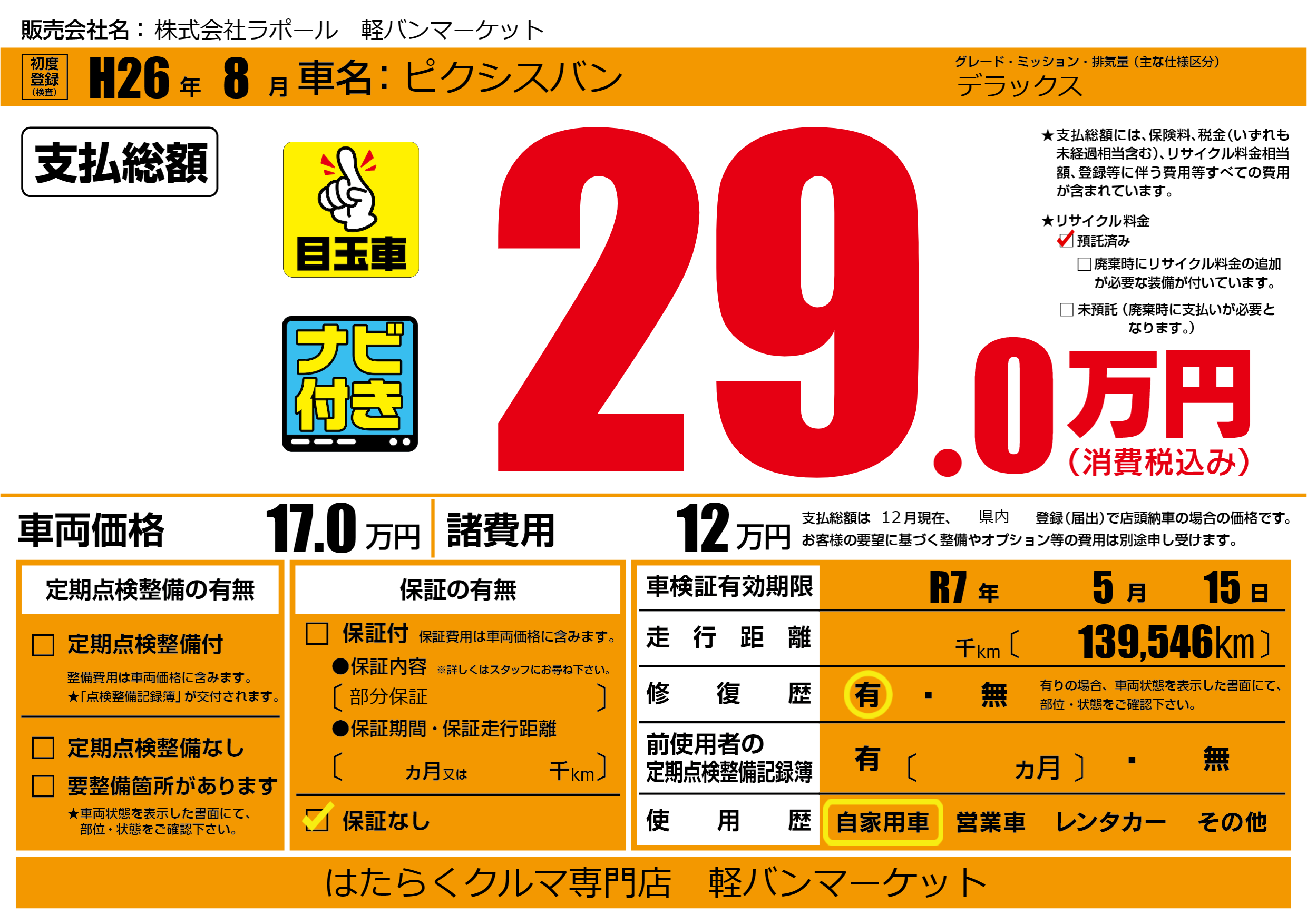 なし | 車検制限 | R7年5月15月 |