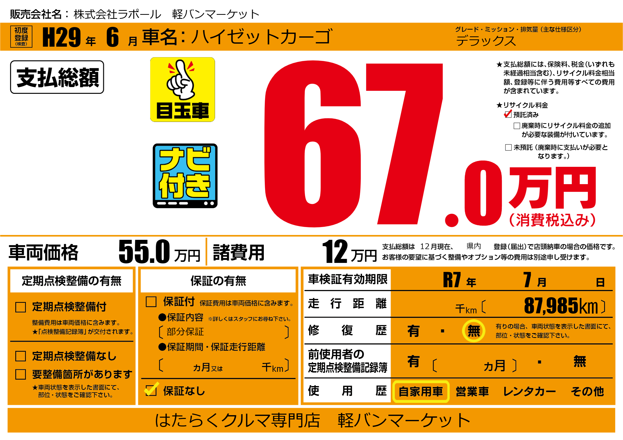 | 車名 | ハイゼットカーゴ | グレード ミッション 排気量 |