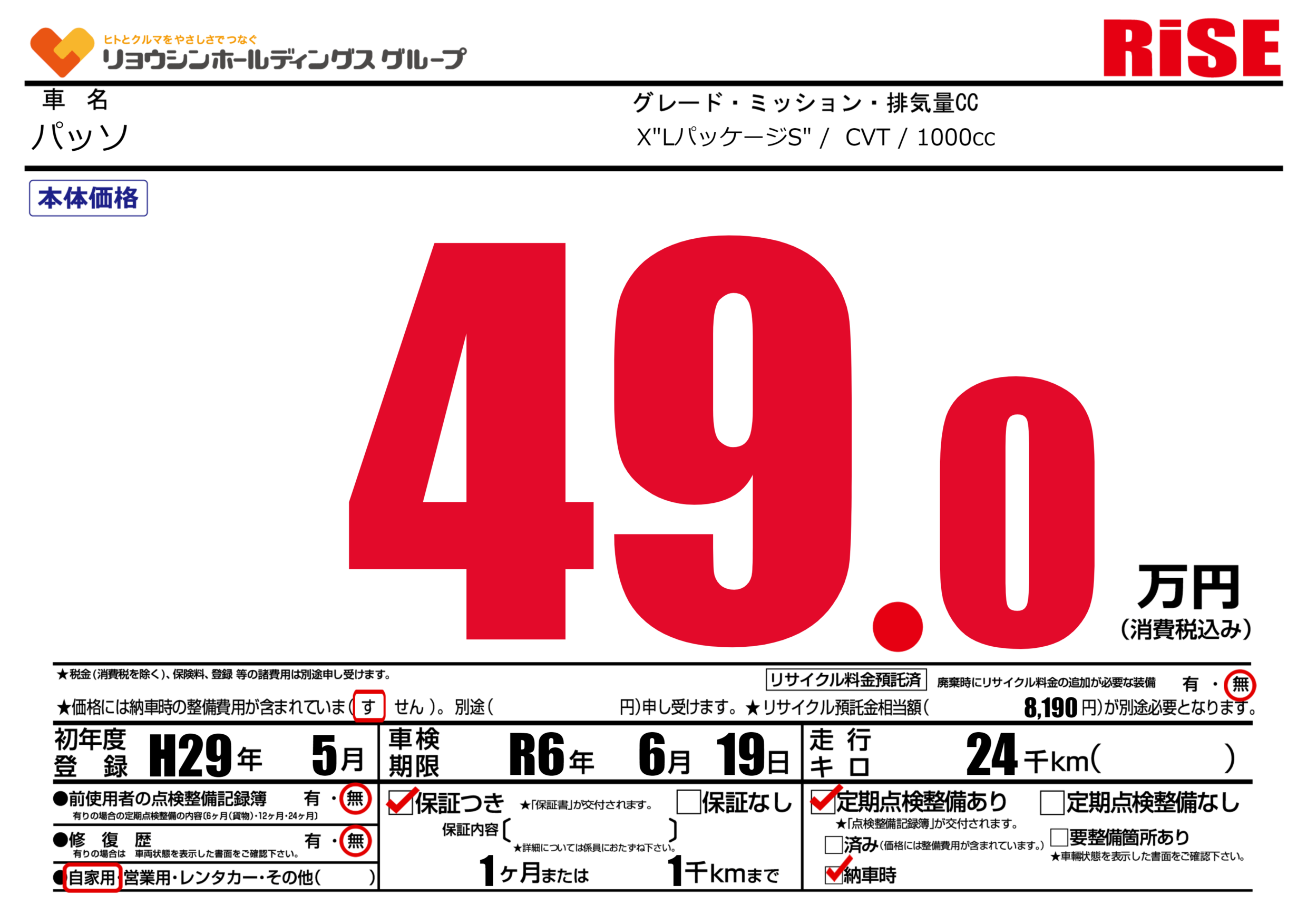 | 車名 | パッソ | グレード ミッション 排気量 |