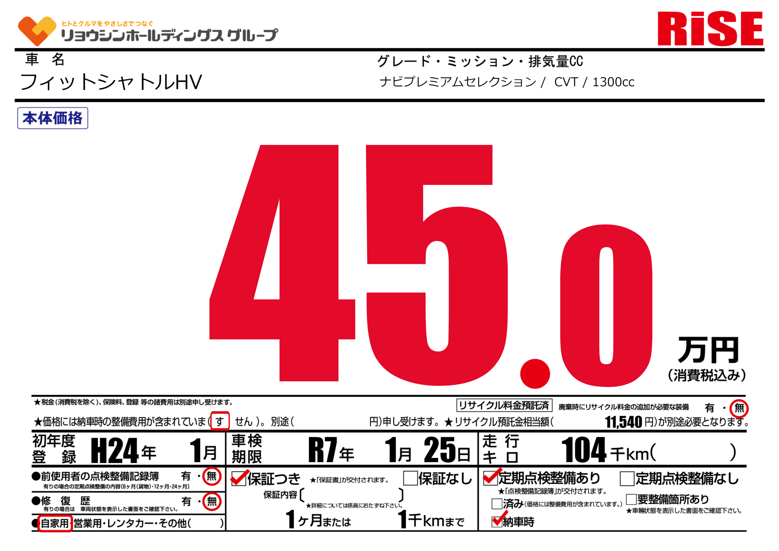 | 車名 | フィットシャトルHV | グレード ミッション 排気量 |