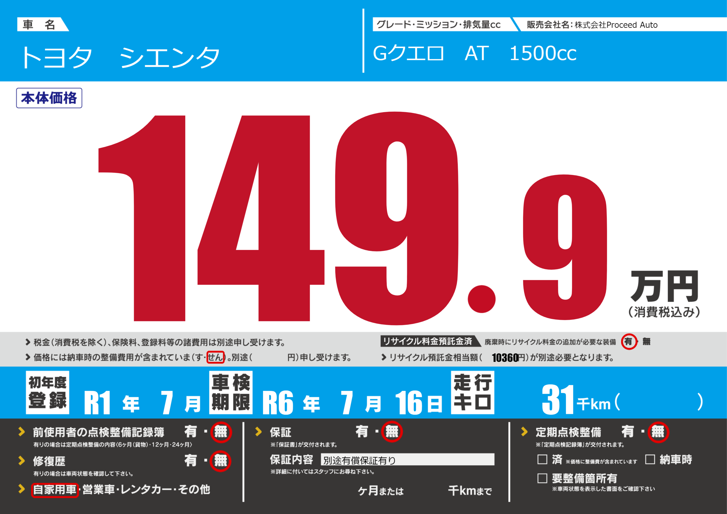 保証なし 保証内容(別途有償保証有り) ---ヶ月または()千kmまで |