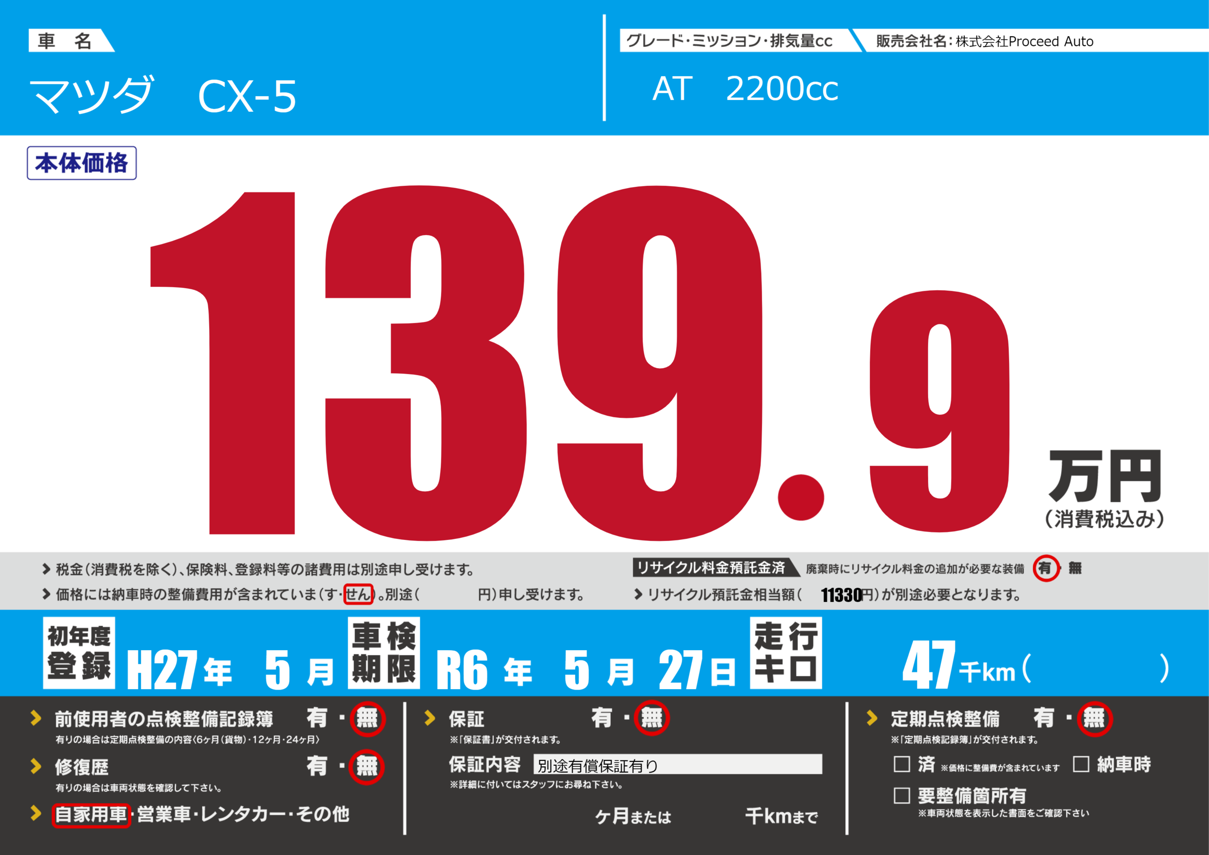 | 走行キロ | 4.7万km | 初年度登録 | H27年5月 |