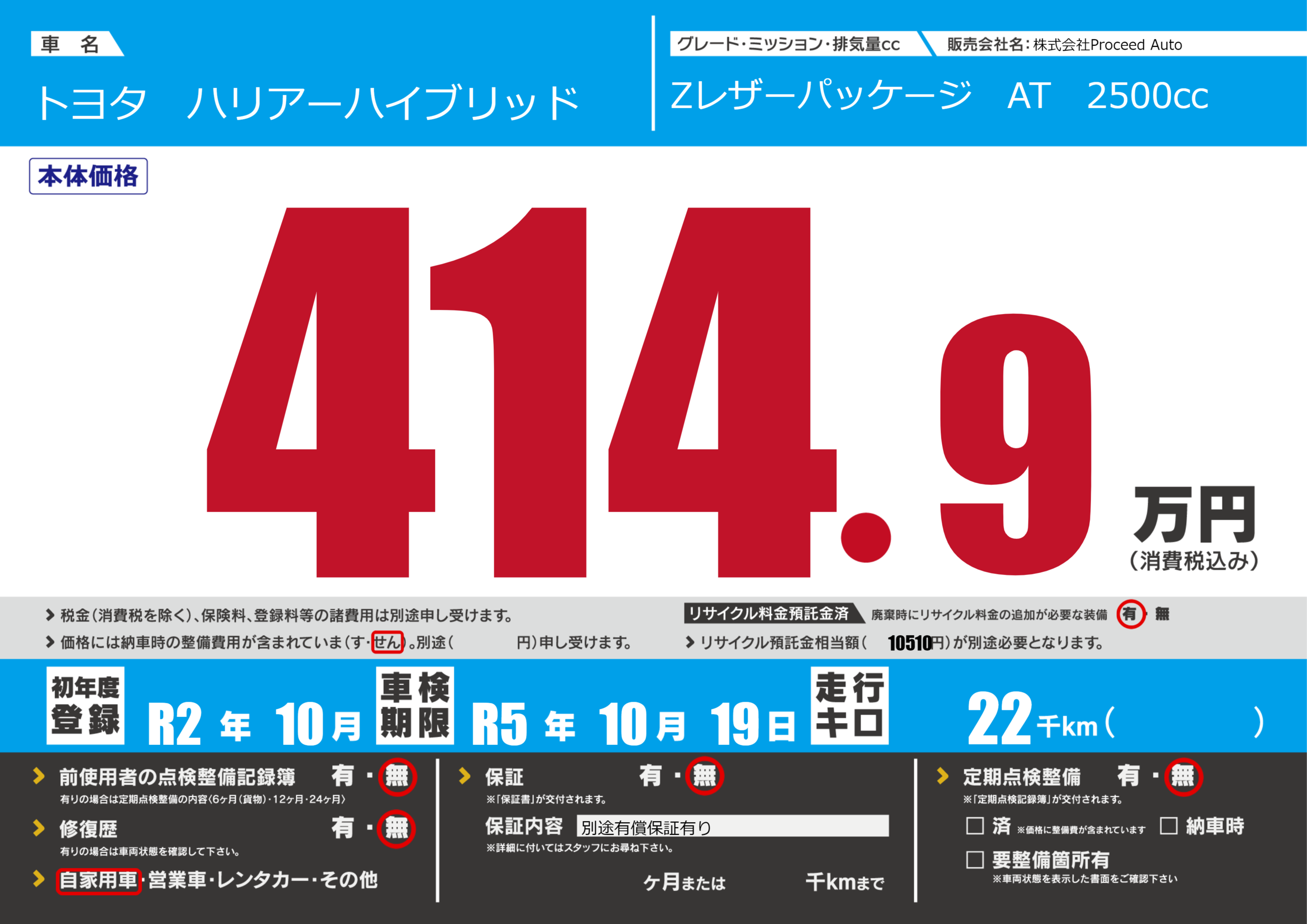 | 車名 | トヨタ ハリアーハイブリッド | グレード ミッション 排気量 |
