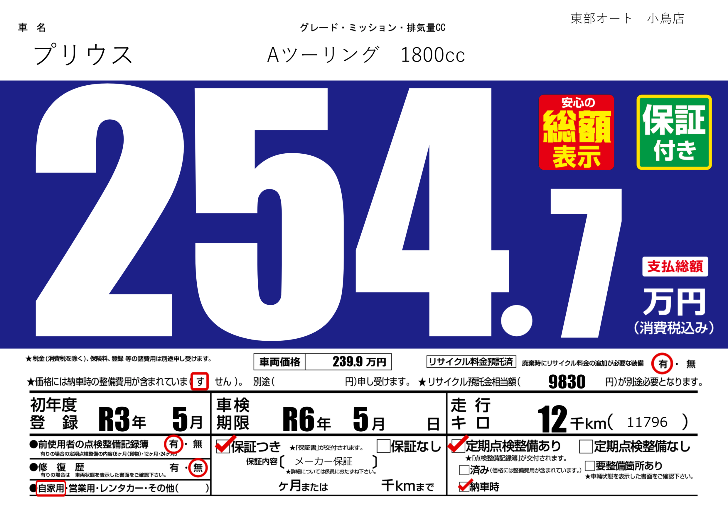 | 車名 | プリウス | グレード ミッション 排気量 |