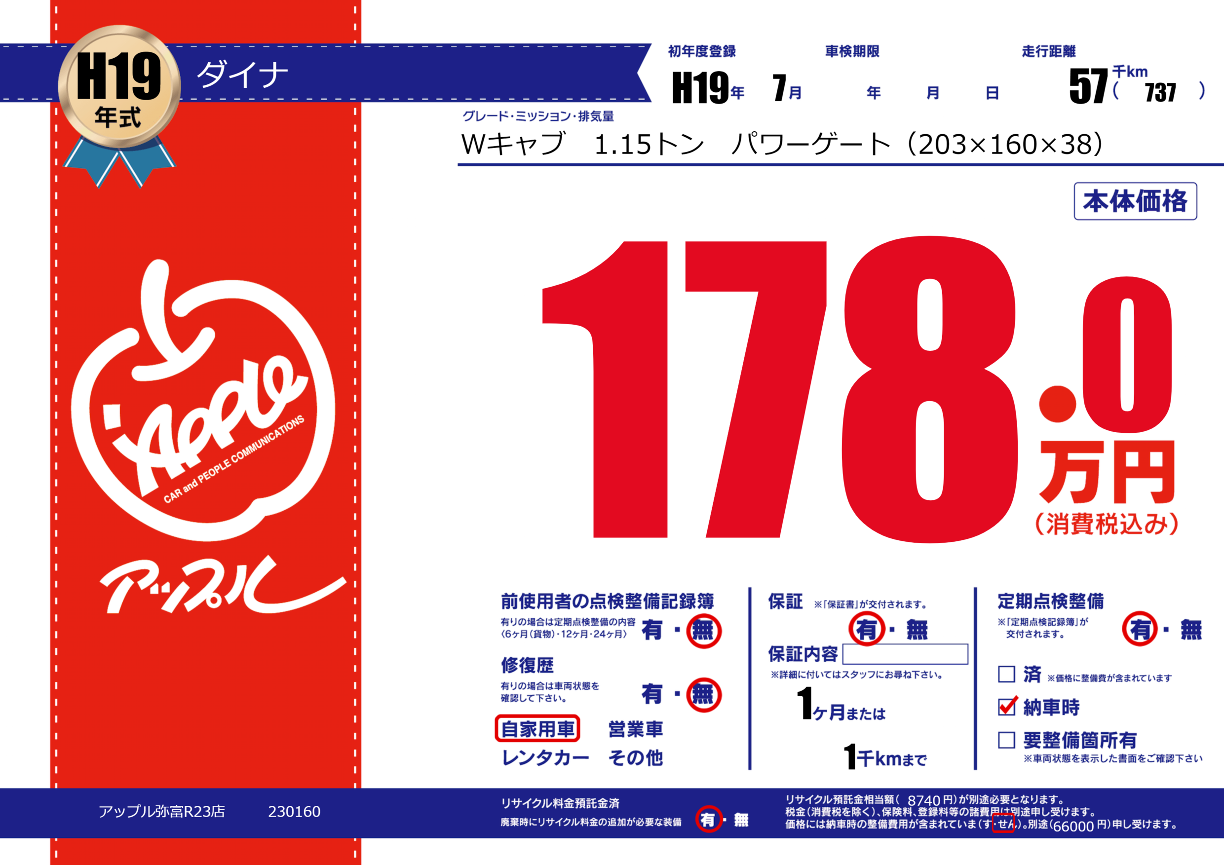 | 走行キロ | 5.7万km | 初年度登録 | H19年7月 |