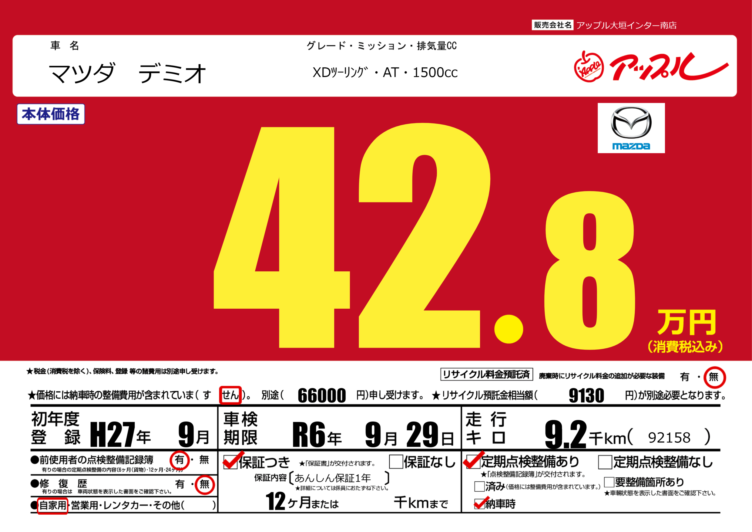 | 車名 | マツダ デミオ | グレード ミッション 排気量 |