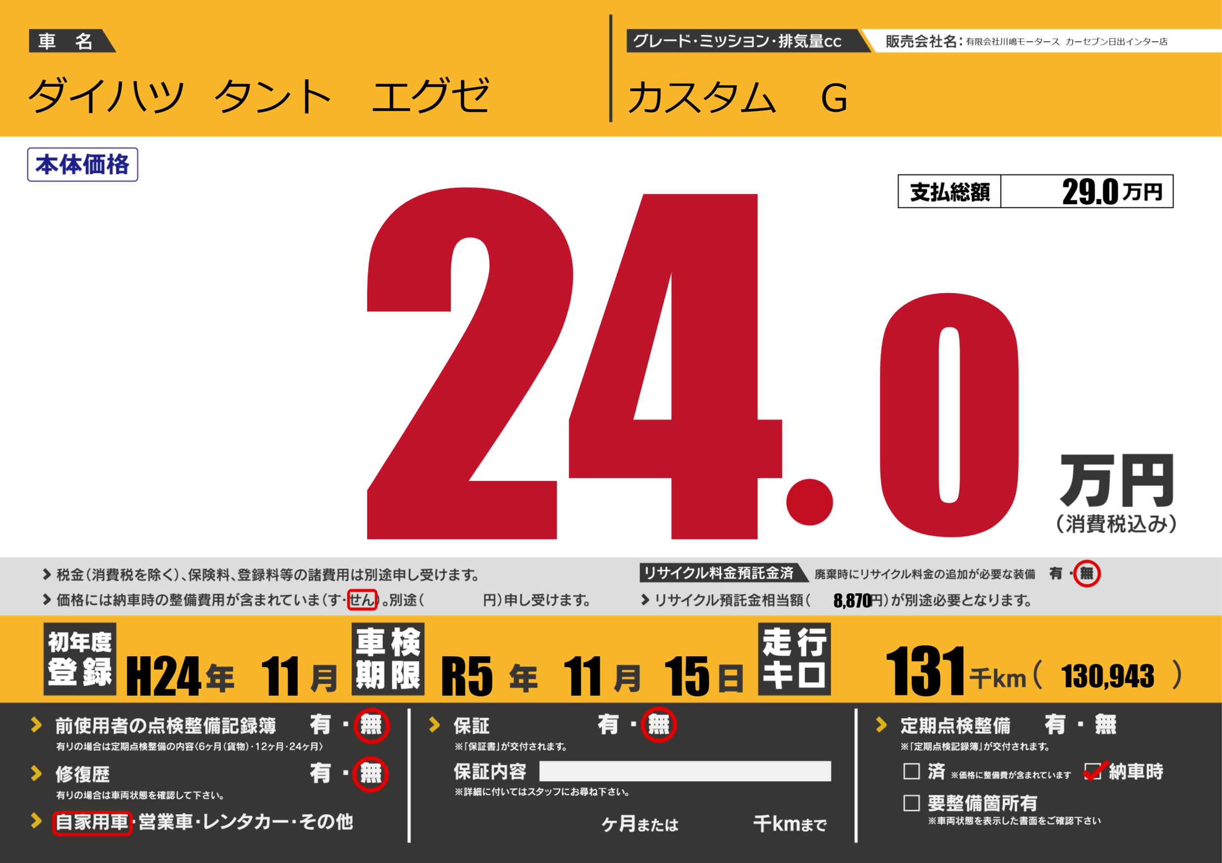 | 走行キロ | 13.1万km | 初年度登録 | H24年11月 |
