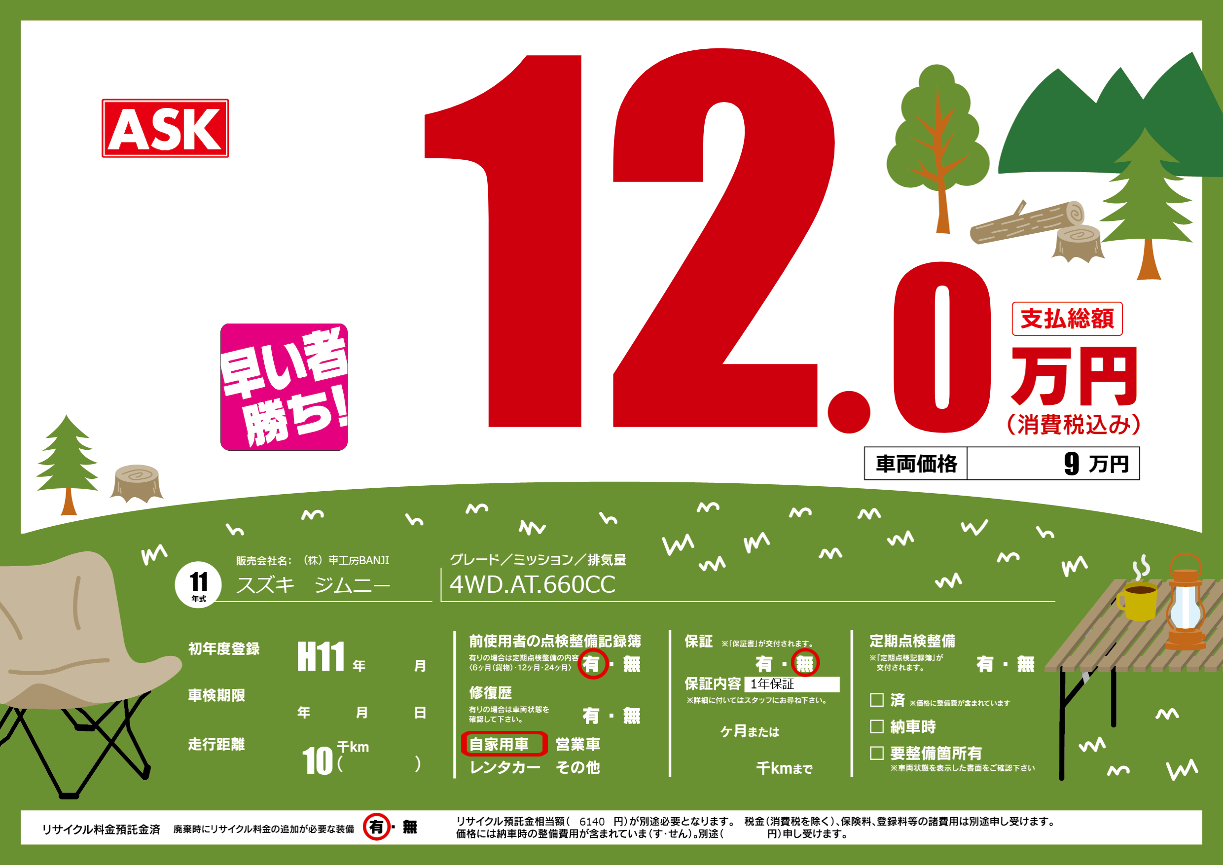 保証なし 保証内容(1年保証) ヶ月または千km |