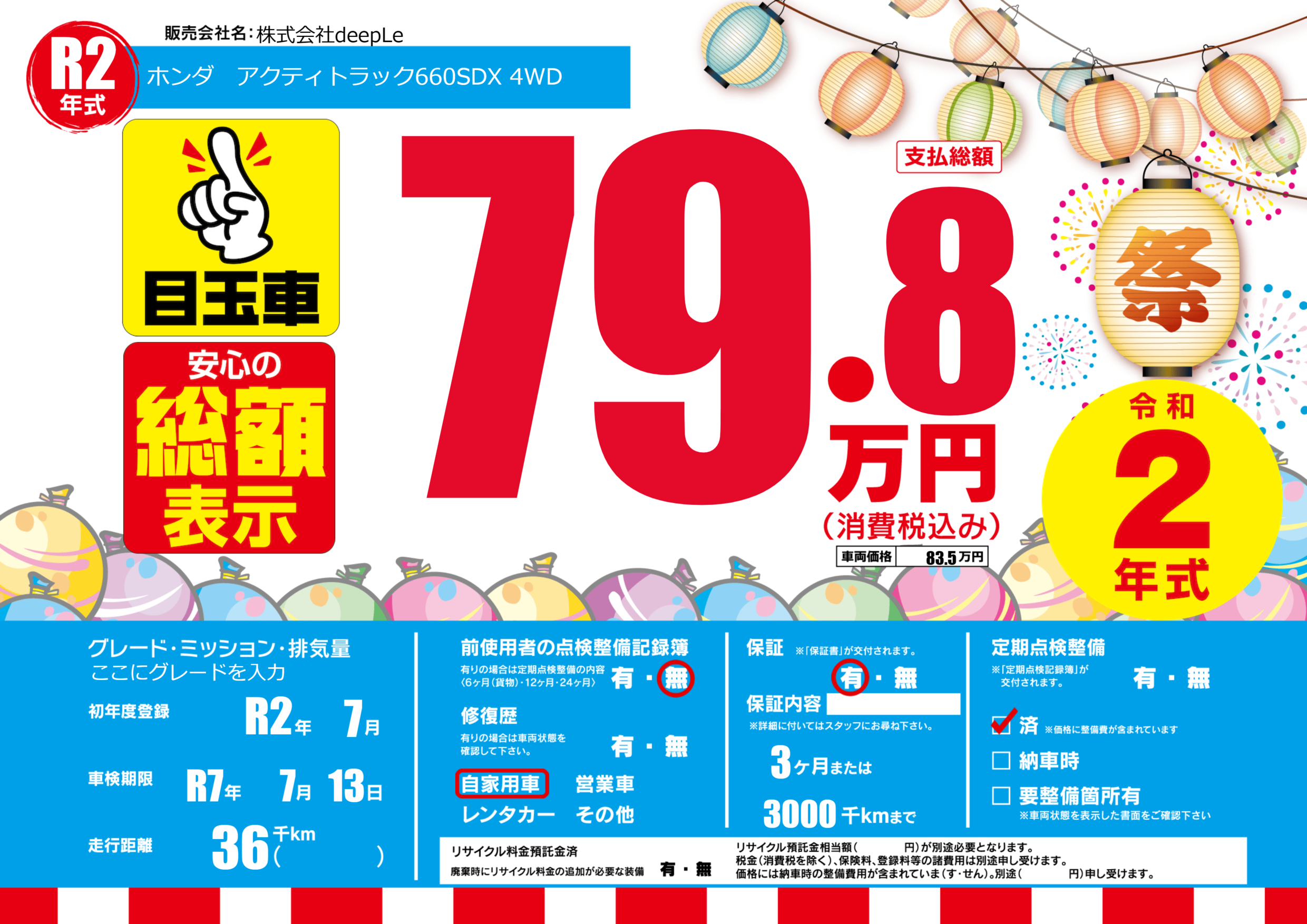 | 車名 | ホンダ アクティトラック660SDX 4WD | グレード ミッション 排気量 |
