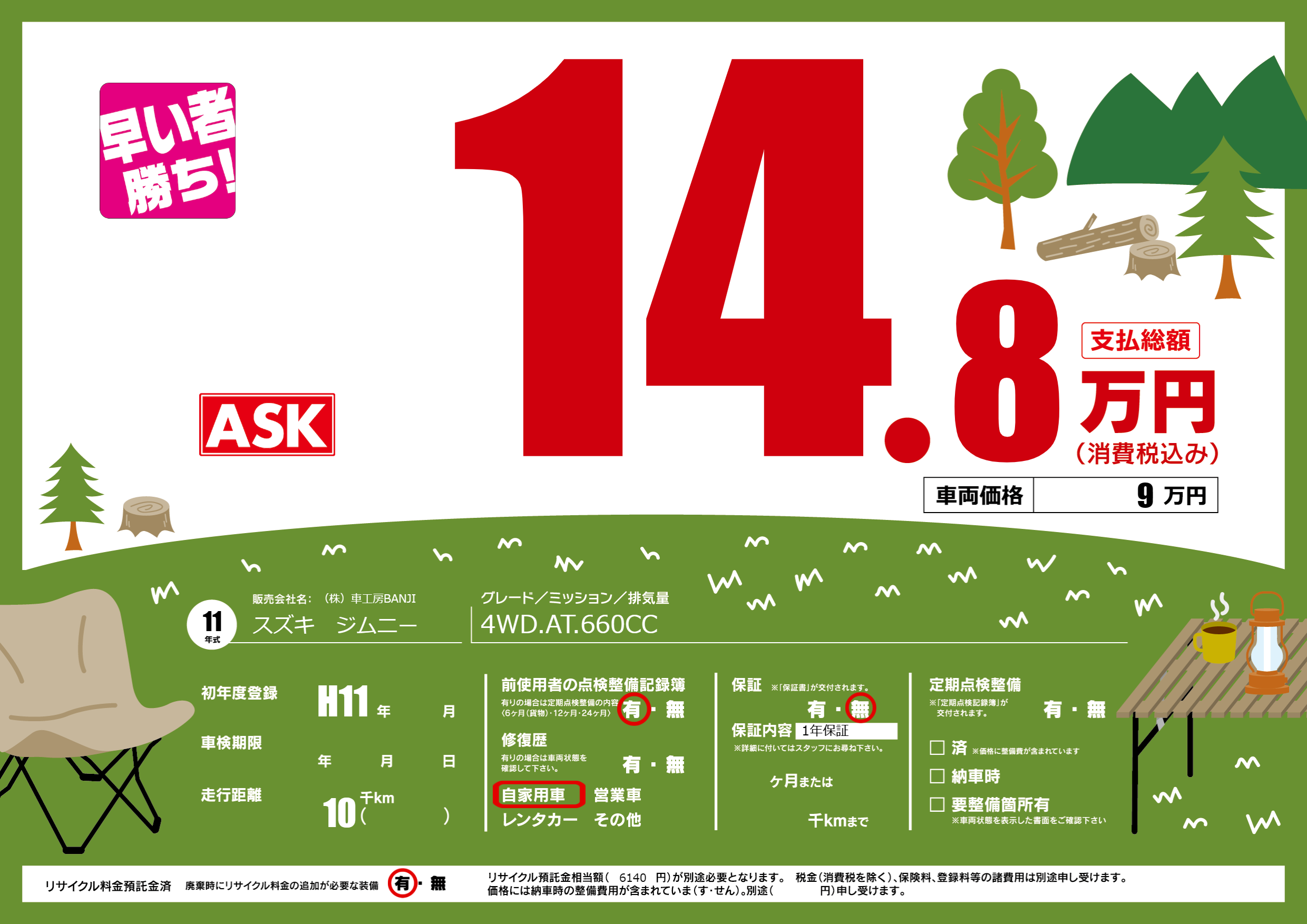 | 車名 | スズキ ジムニー | グレード ミッション 排気量 |