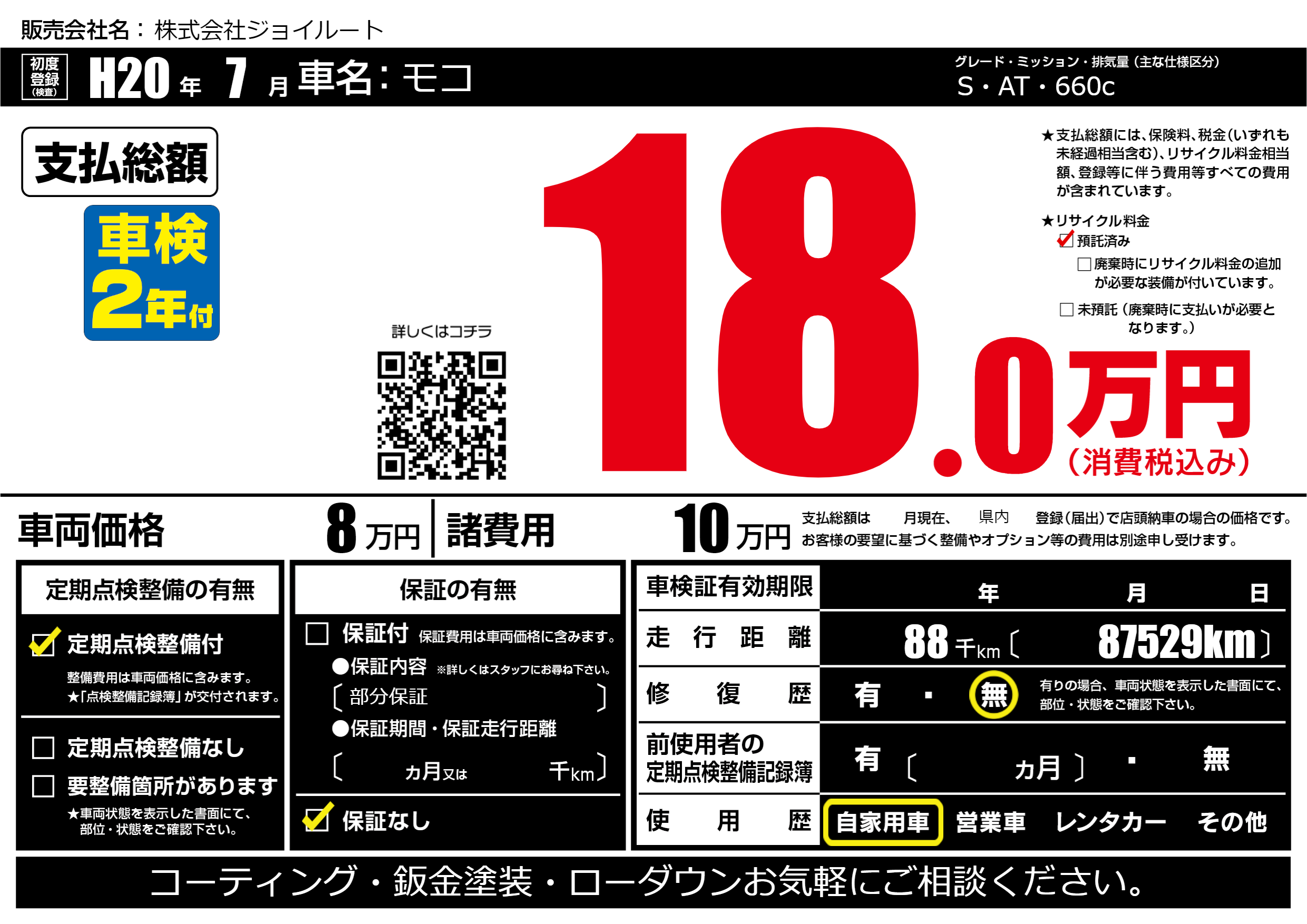 | 走行キロ | 8.8万km | 初年度登録 | H20年7月 |