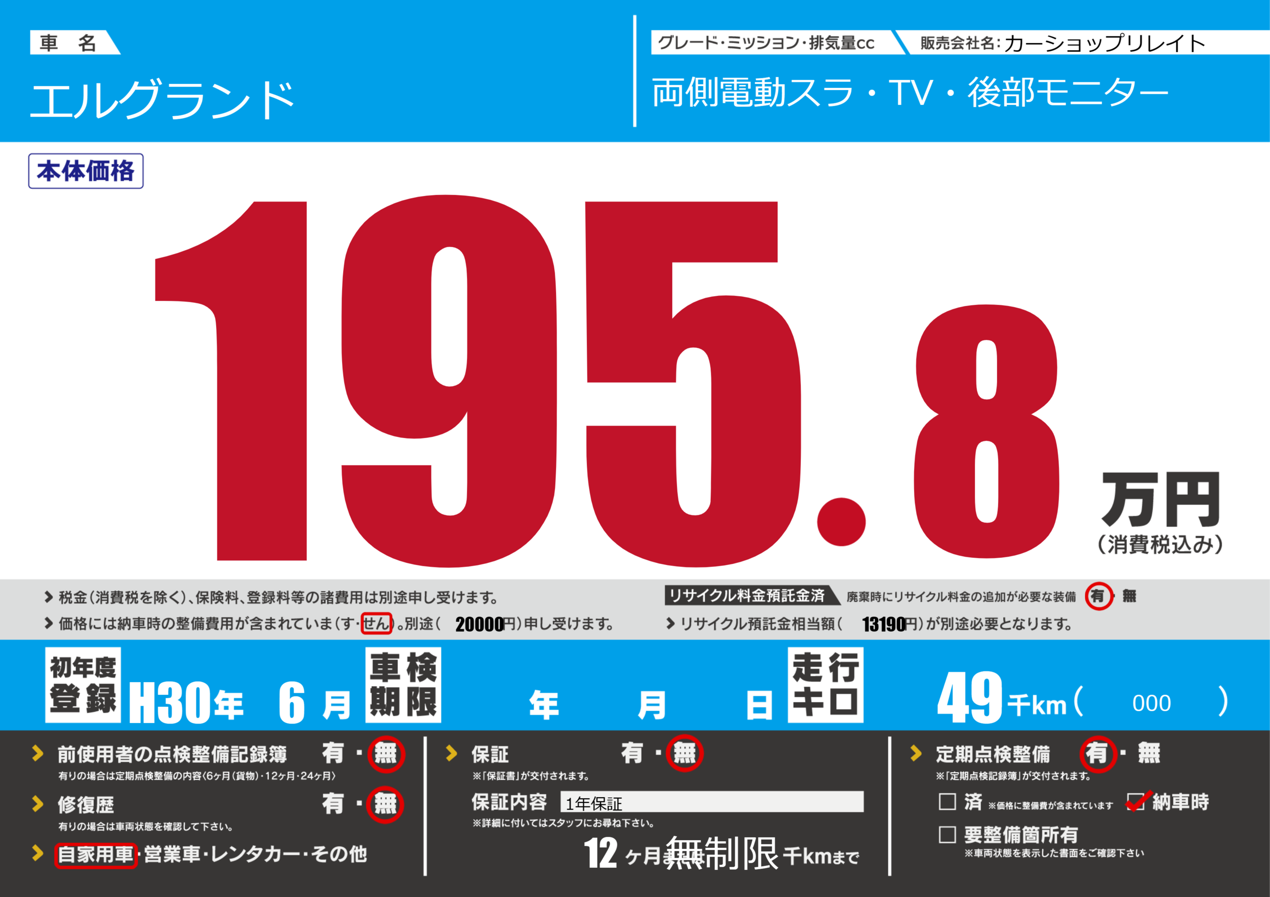 | 車名 | エルグランド | グレード ミッション 排気量 |