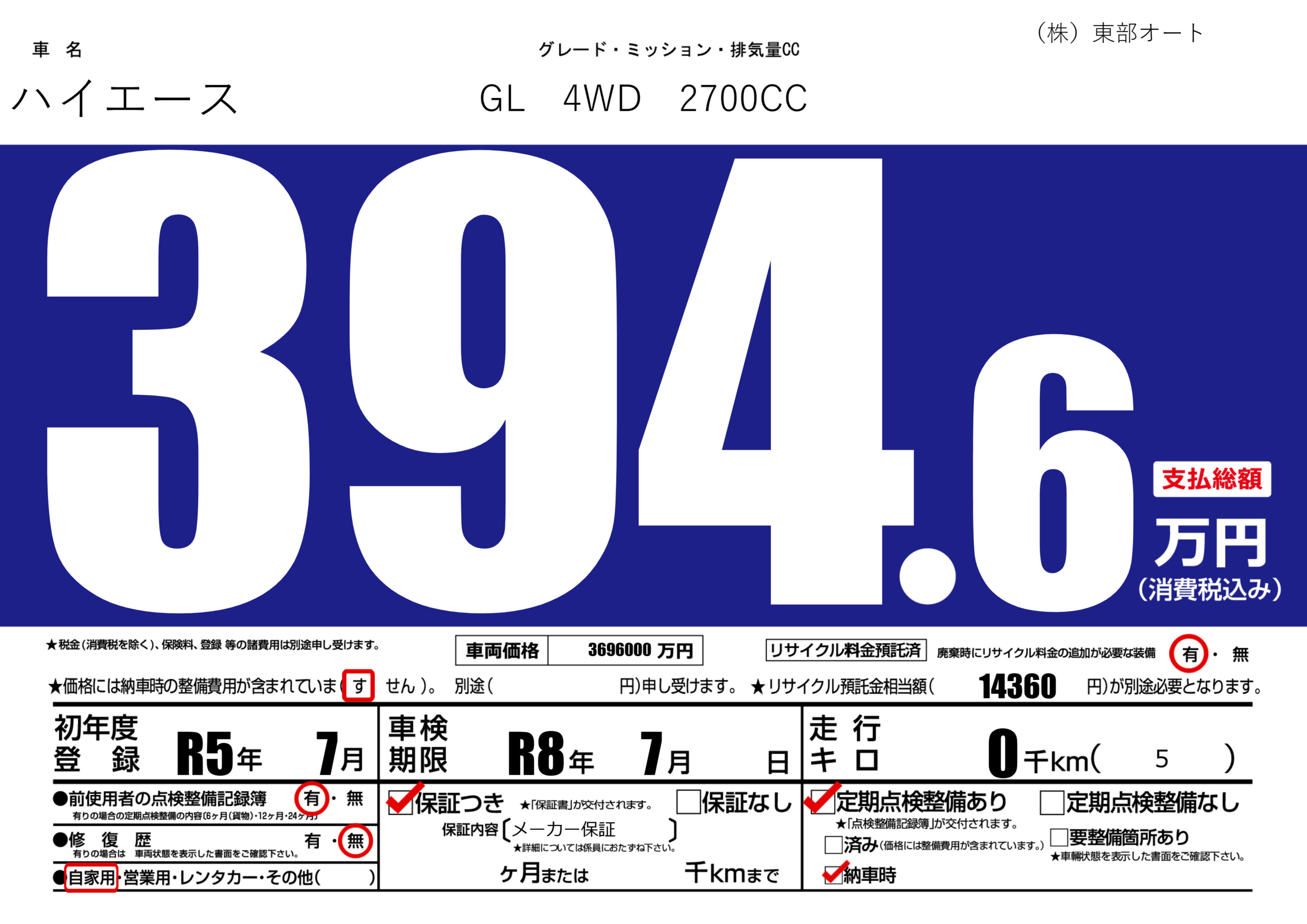 | 車名 | ハイエース | グレード ミッション 排気量 |