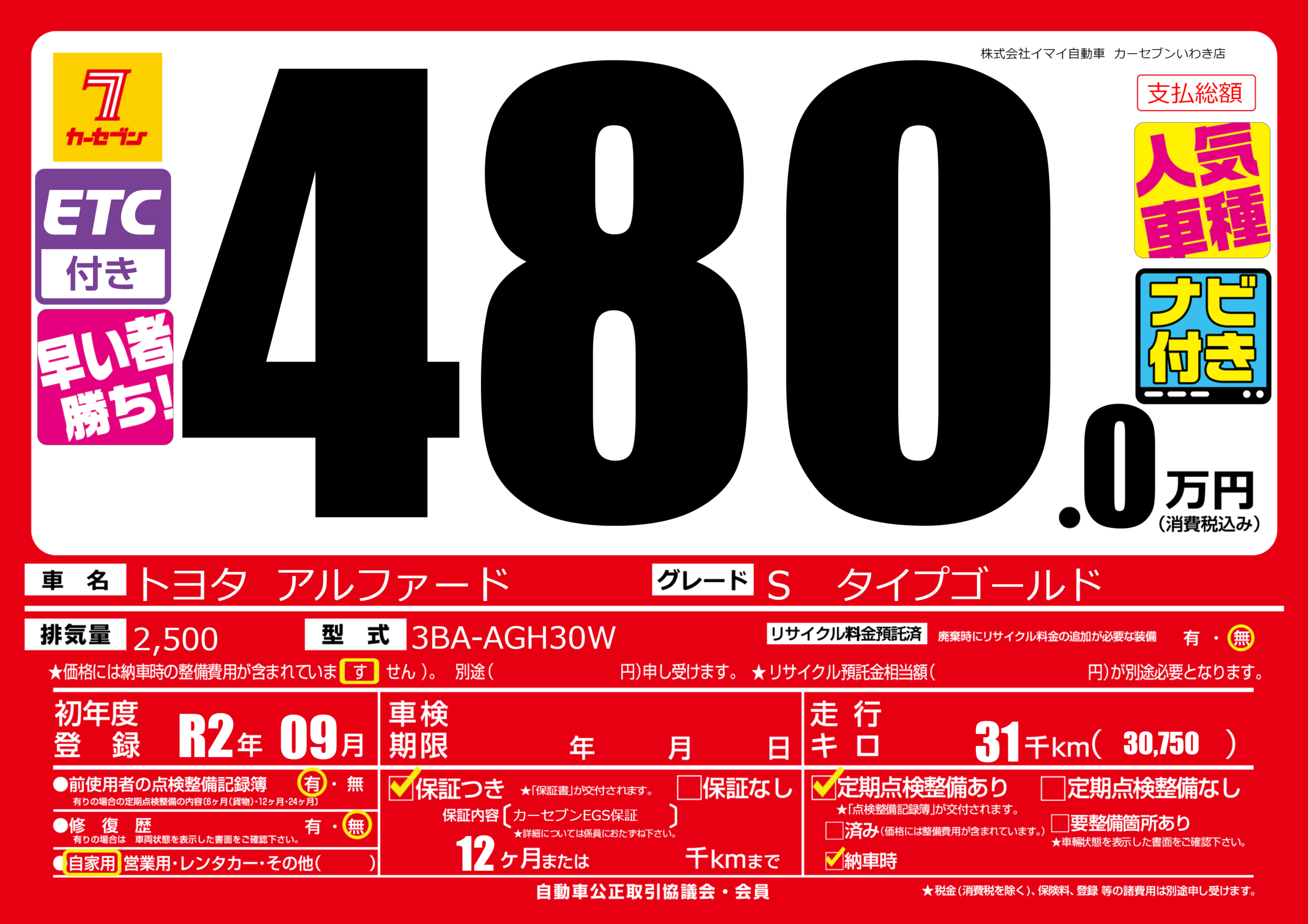 保証付き 保証内容(カーセブンEGS保証) 12ヶ月または千km |