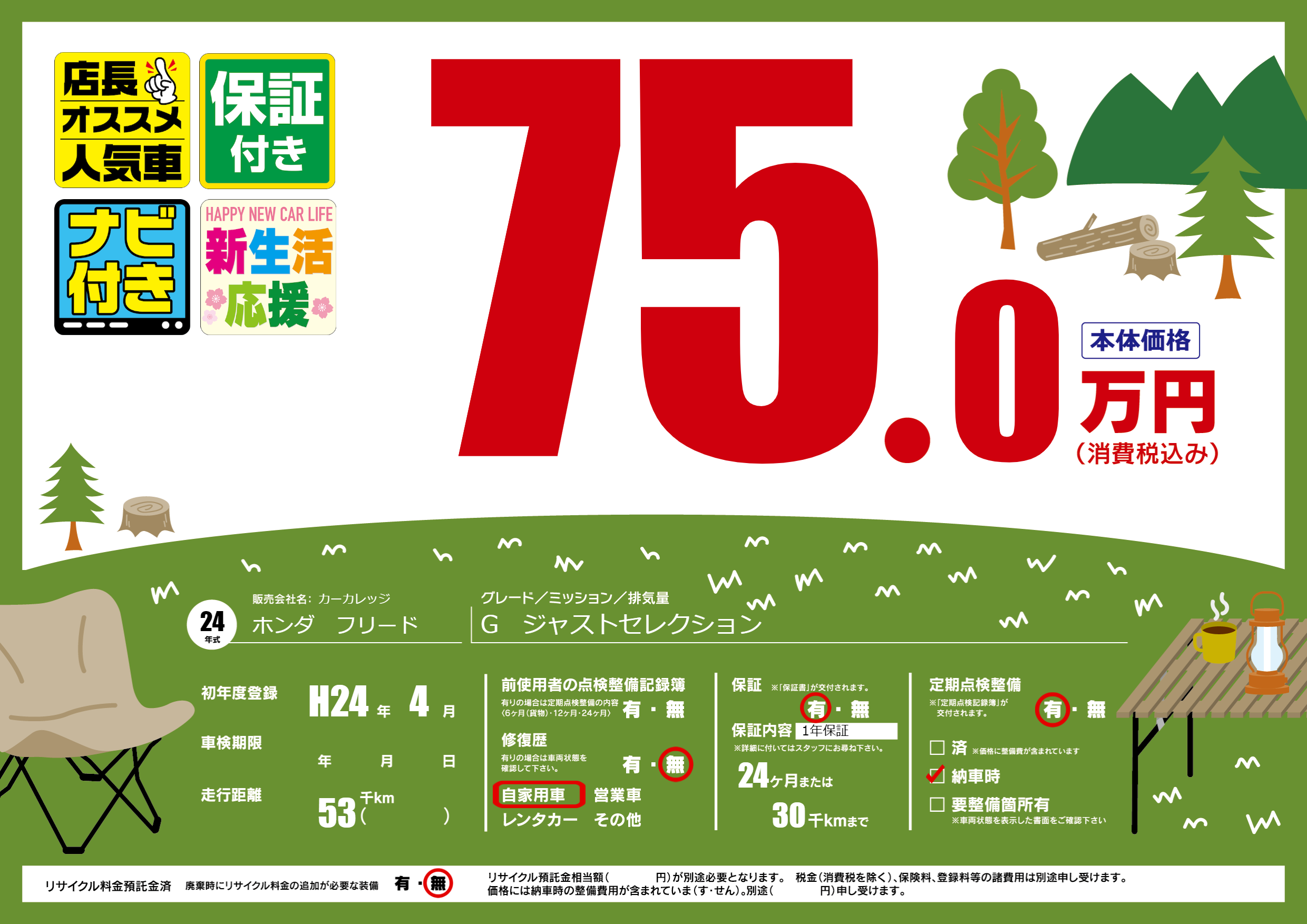 | 車名 | ホンダ フリード | グレード ミッション 排気量 |