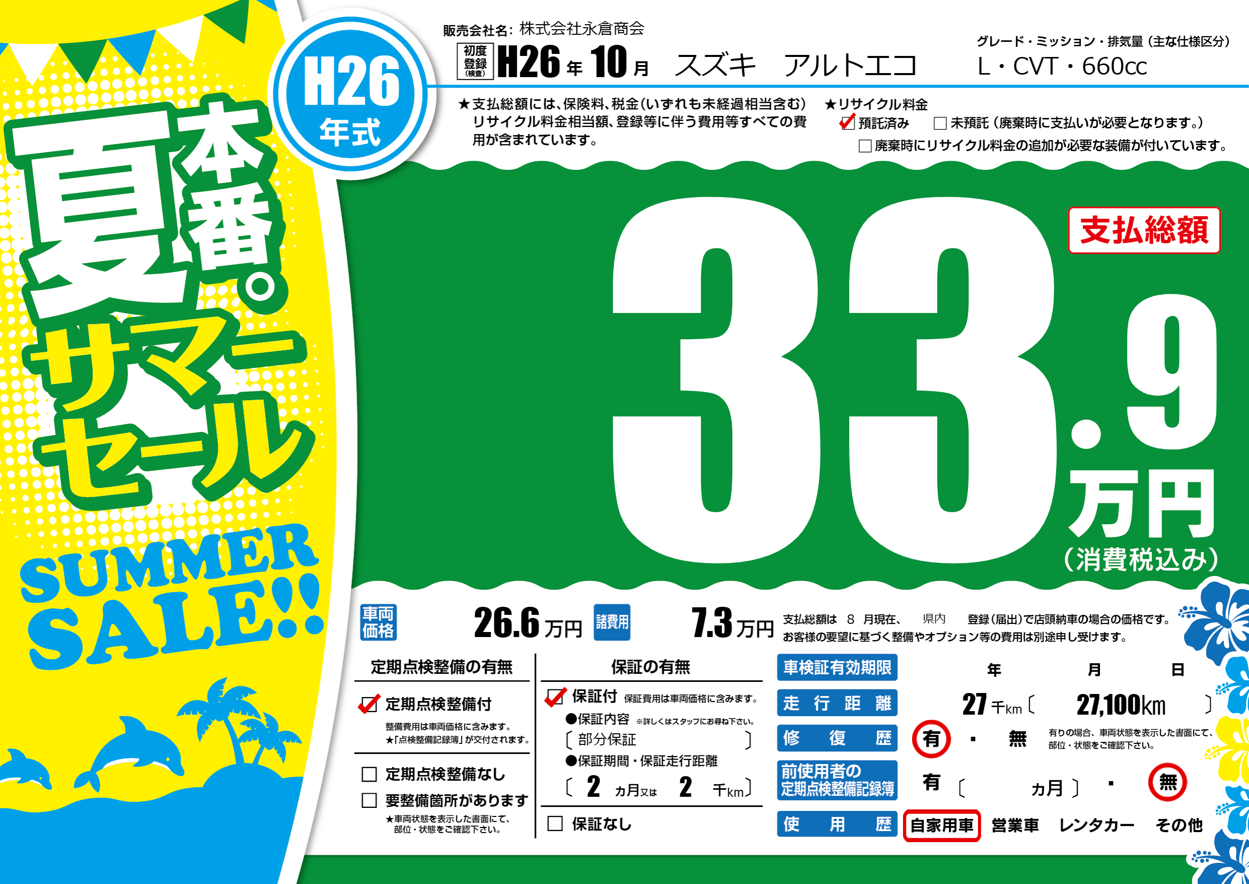 | 走行キロ | 2.7万km | 初年度登録 | H26年10月 |