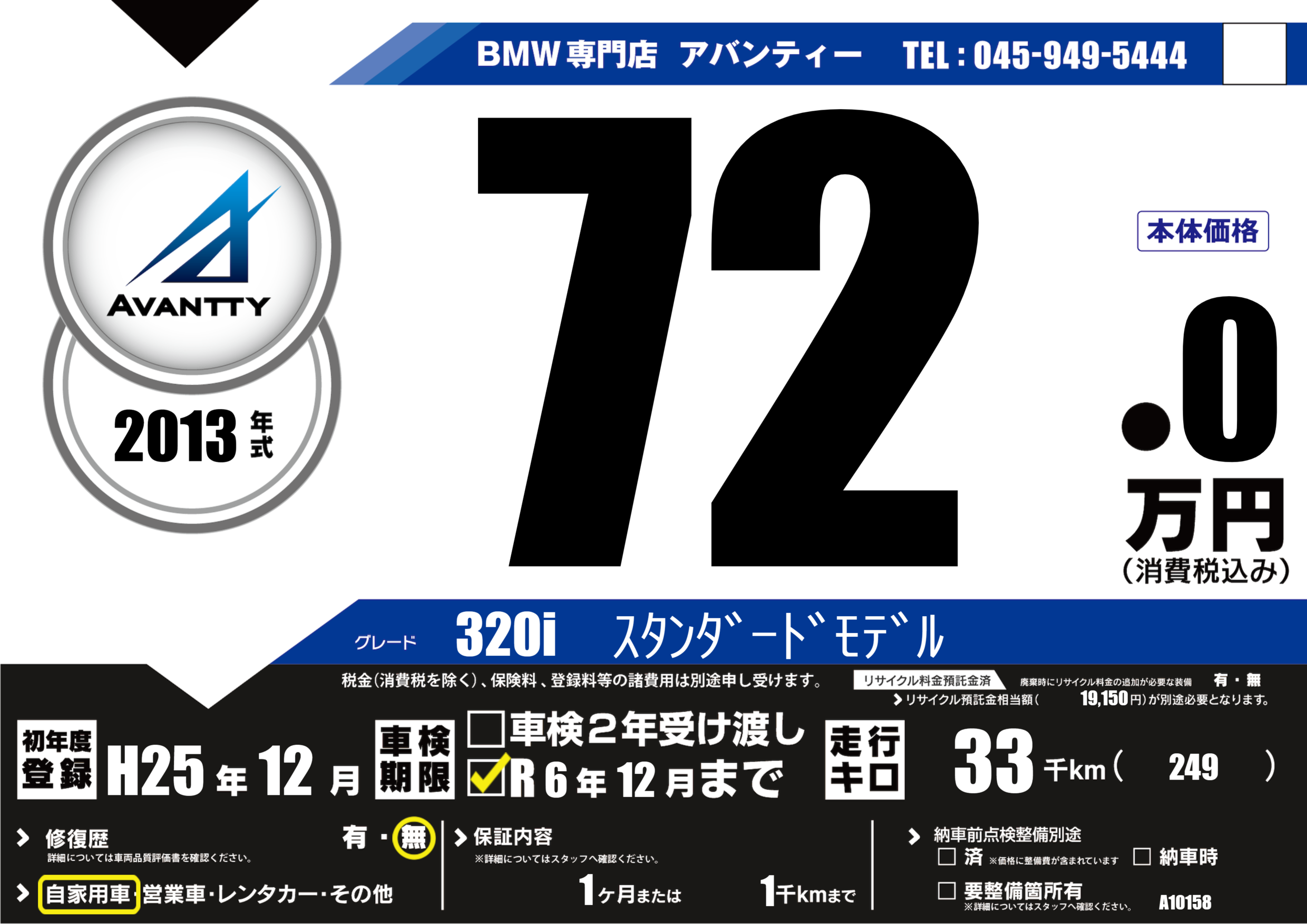 | 走行キロ | 3.3万km | 初年度登録 | H25年12月 |