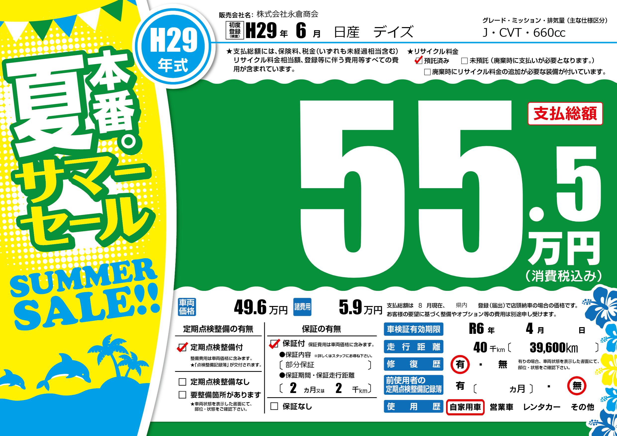 | 走行キロ | 4万km | 初年度登録 | H29年6月 |