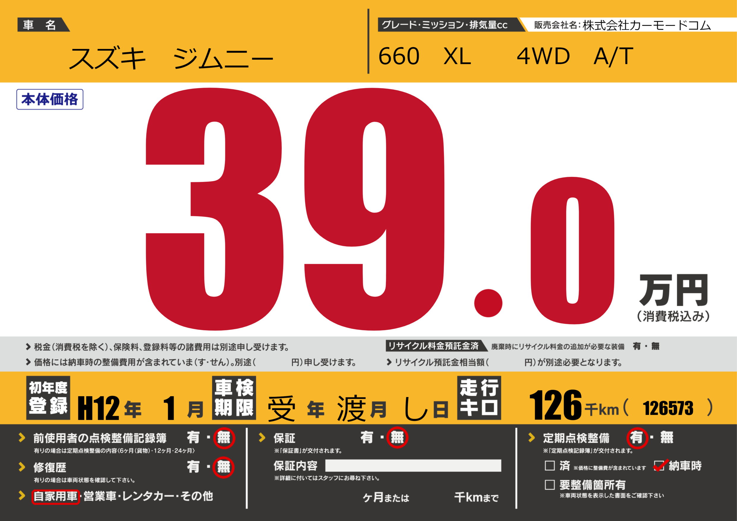 | 走行キロ | 12.6万km | 初年度登録 | H12年1月 |