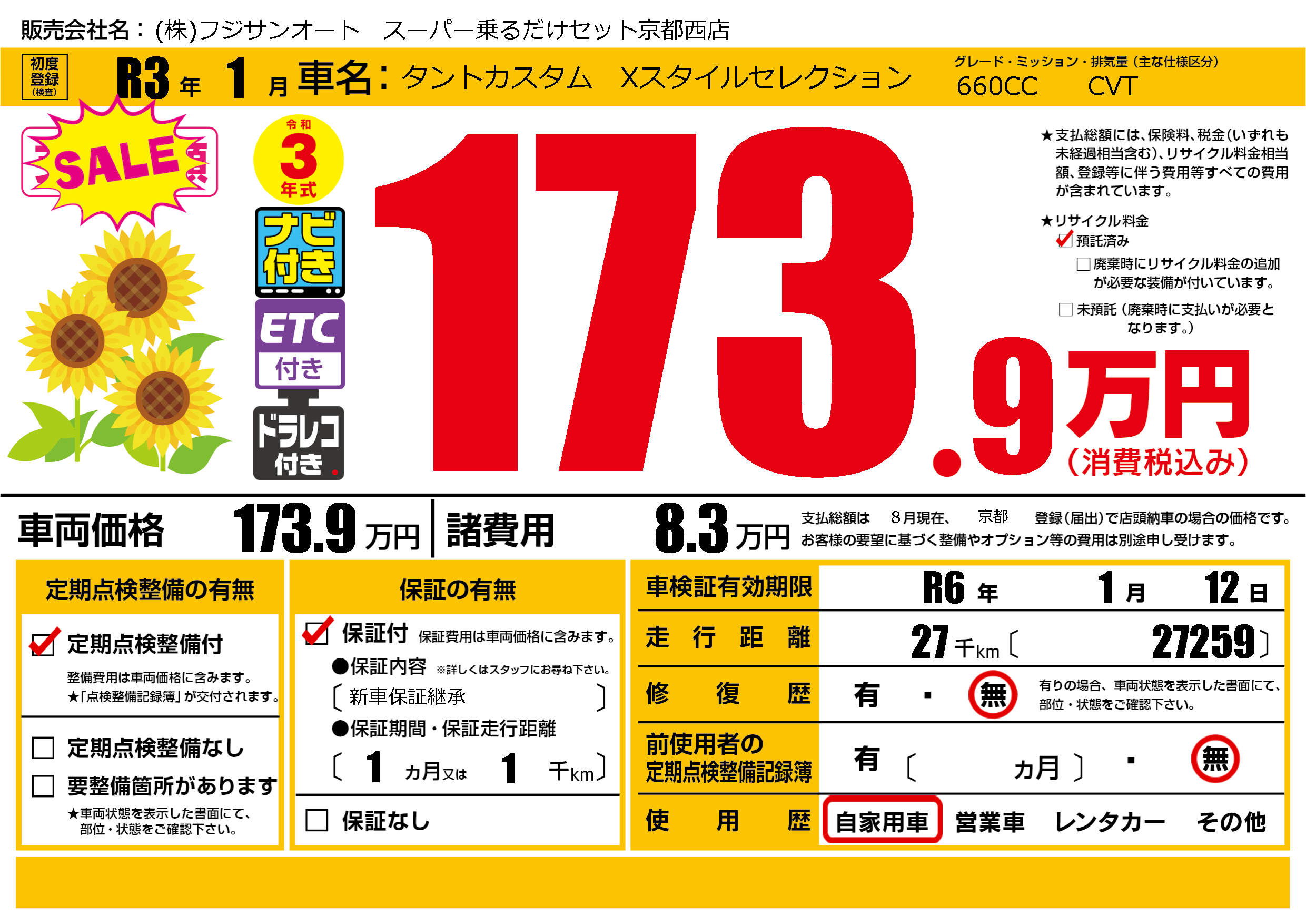 | 車名 | タントカスタム Xスタイルセレクション | グレード ミッション 排気量 |