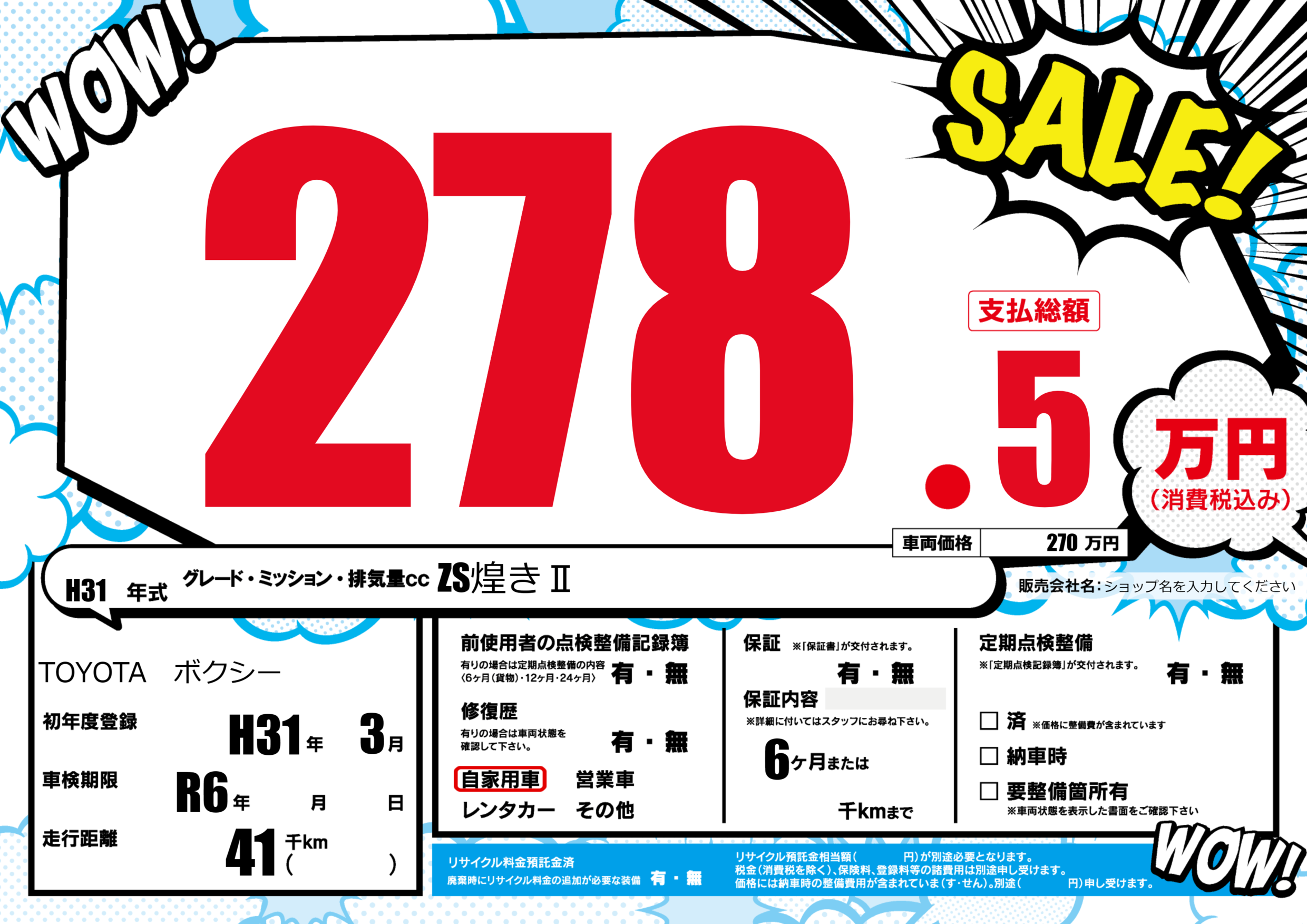 | 車名 | TOYOTA ボクシー | グレード ミッション 排気量 |