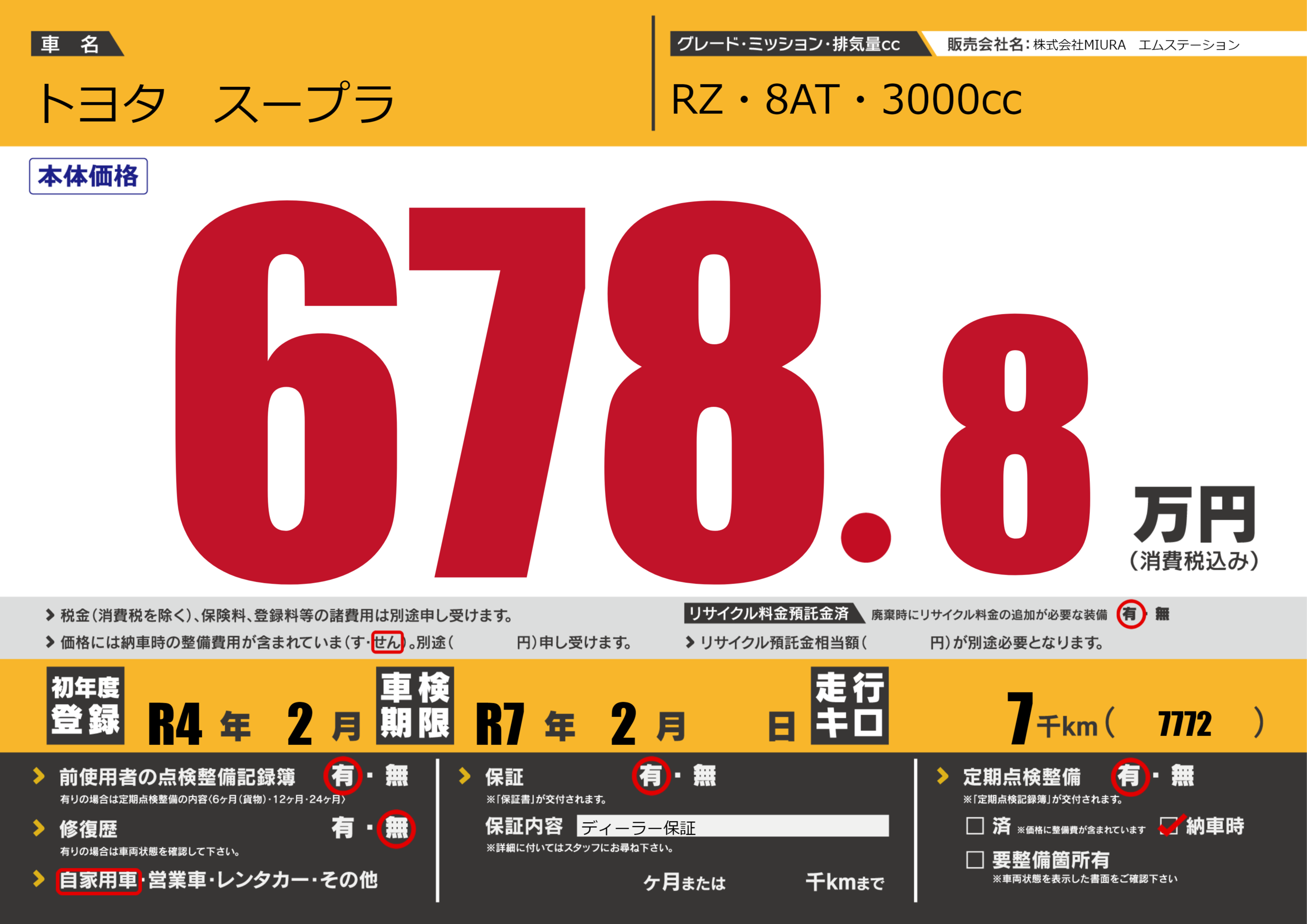 | 車名 | トヨタ スープラ | グレード ミッション 排気量 |