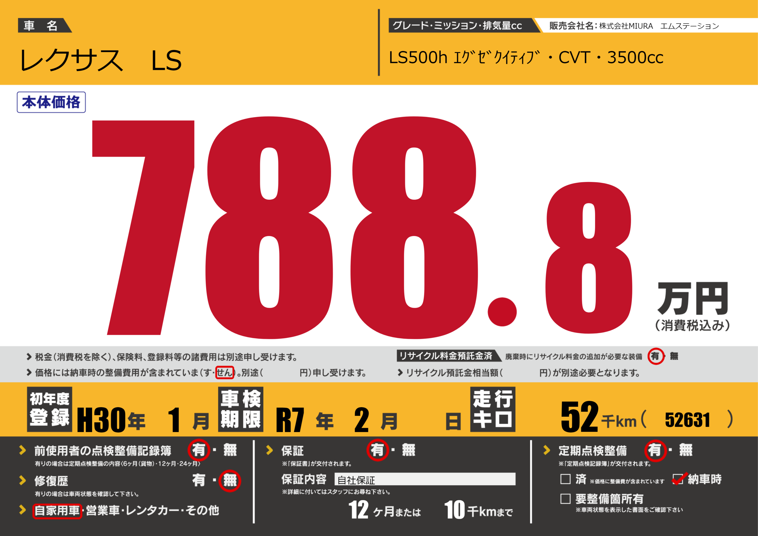 | 車検制限 | R7年 2月 - 日 | ||