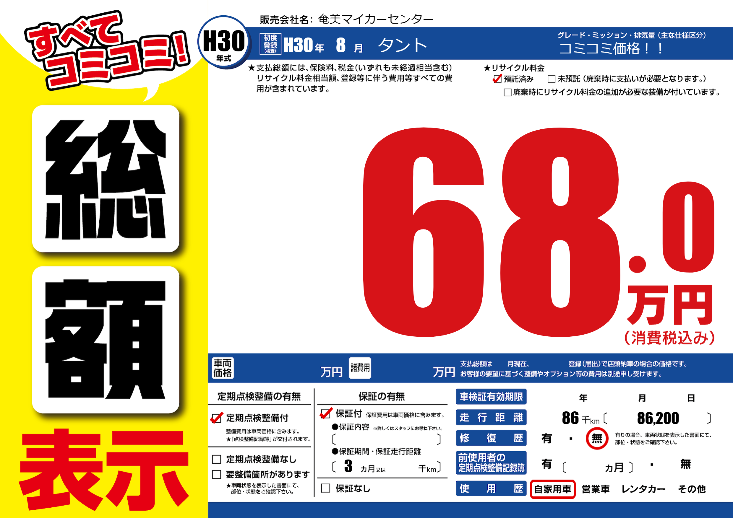 | 走行キロ | 8.6万km | 初年度登録 | H30年8月 |