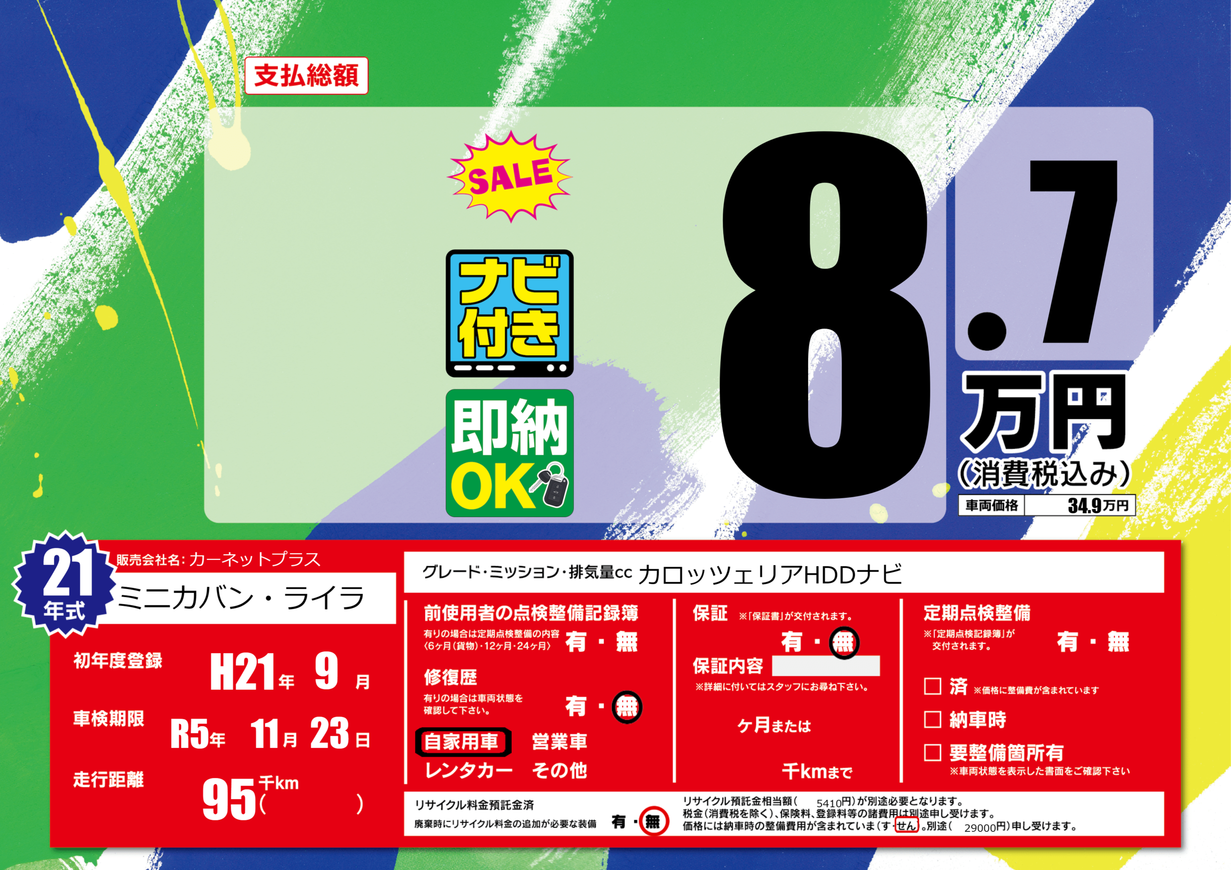 | 走行キロ | 9.5万km | 初年度登録 | H21年9月 |